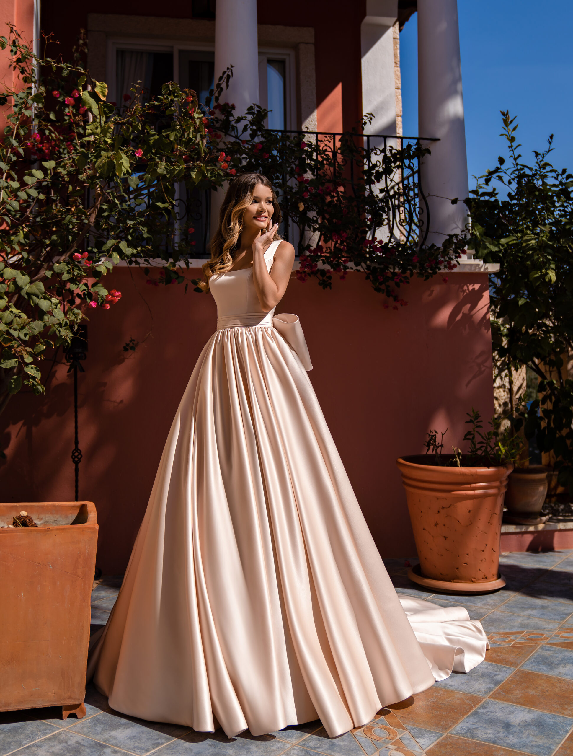 Stunning minimalist bridal gown. The dress is made of “cappuccino” colored royal satin. The front bodice is decorated with a trendy square neckline. On the sides of the skirt are almost invisible pockets. A waistline with graceful drapery accents the waist. A large puppet bow is a real decoration of the image, it ads coquettishness.