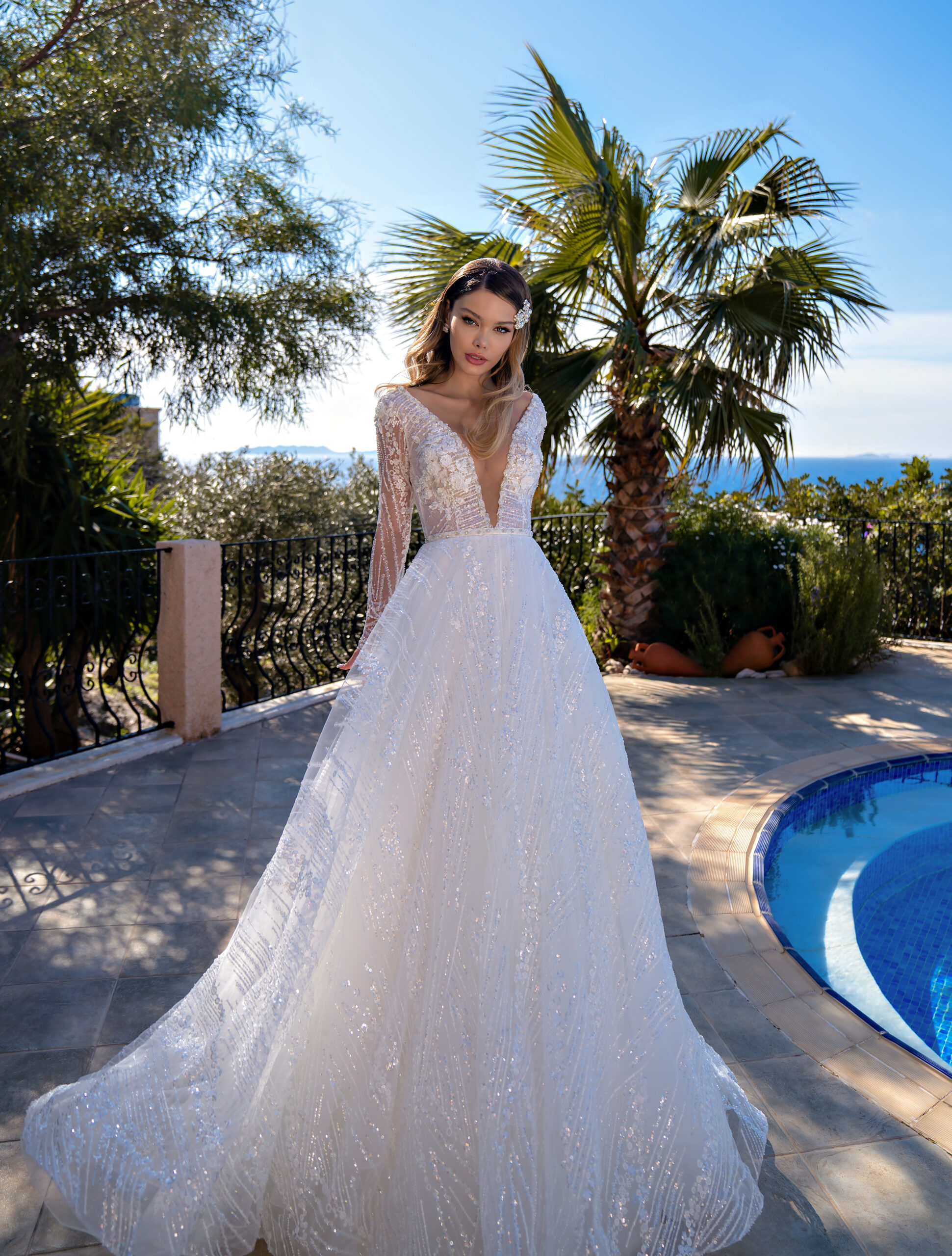 Spectacular wedding dress with long sleeves and a skirt with a train. The front of the bodice is decorated with a deep figured neckline. The wedding dress is made of guipure embroidered with beads, pearls and sequins. Shiny fabric highlights the image. The waist is emphasized with a thin belt decorated with braid embroidered with beads, pearls and stone.