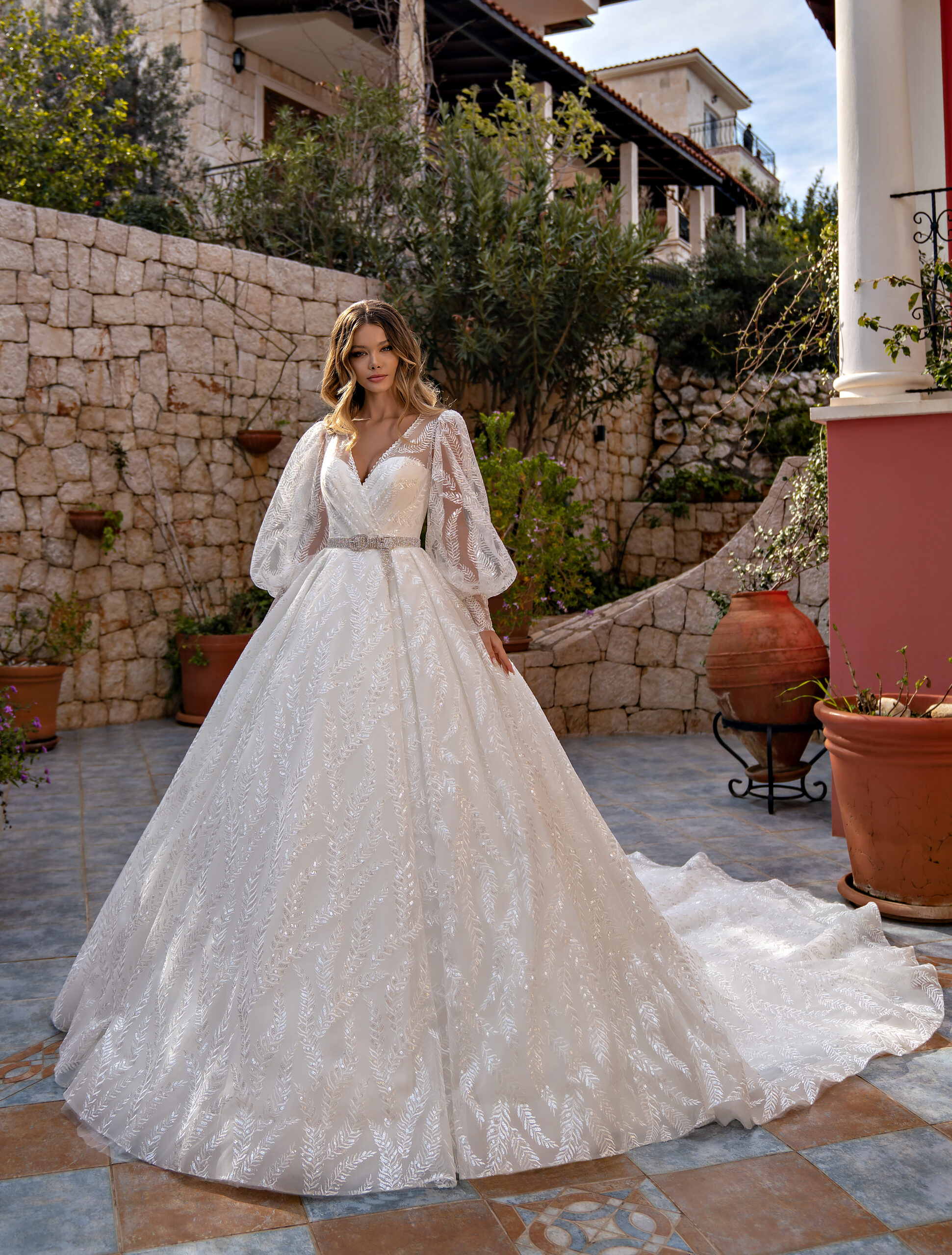 Royal wedding dress made of guipure embroidered with sequin. A bodice to the waist with doll-like fluffy sleeves adds fabulousness to the look. A fluffy skirt successfully harmonizes with the top. The waist is gracefully emphasized by a removable belt of stones. The model is decorated with beads, pearls, sequins.