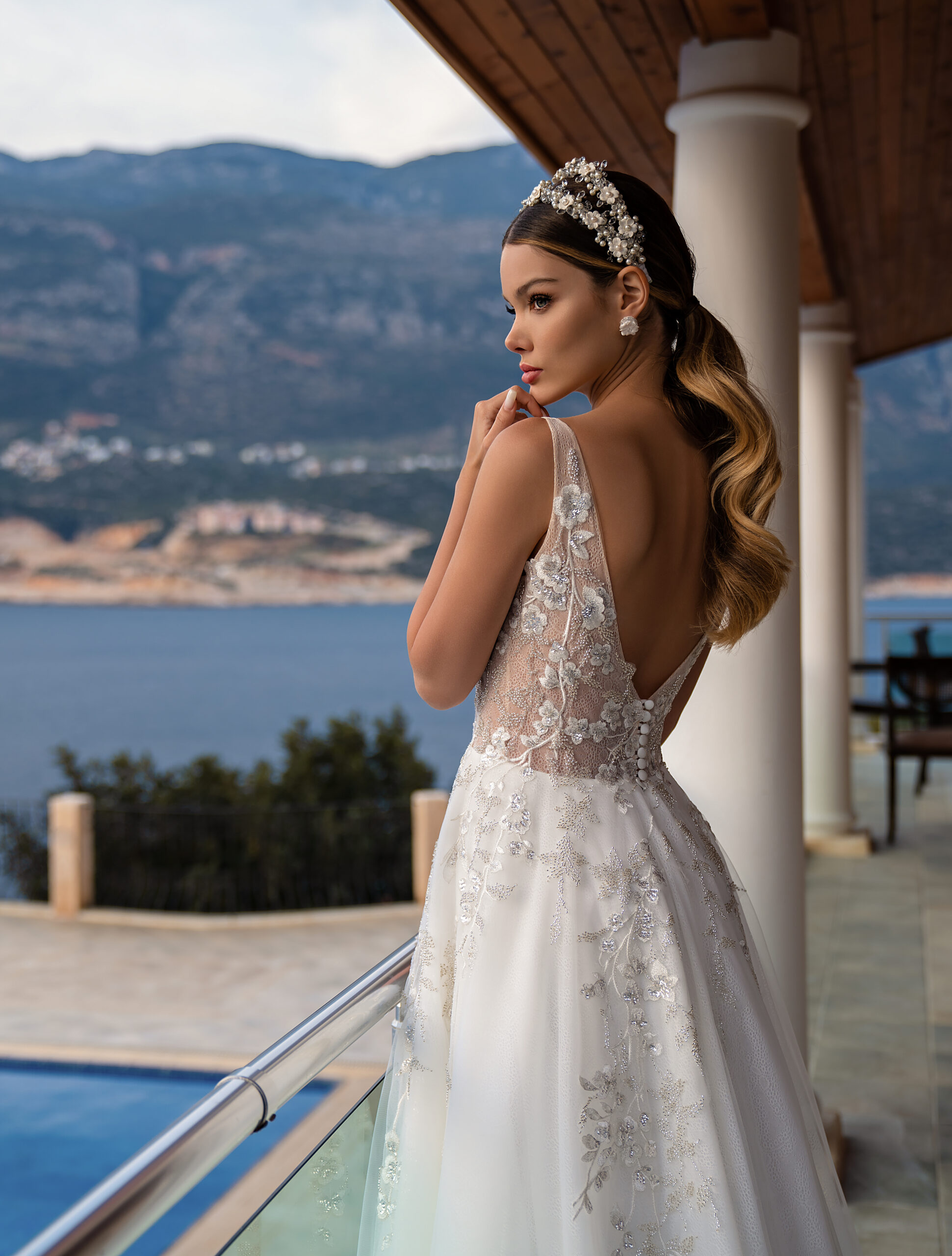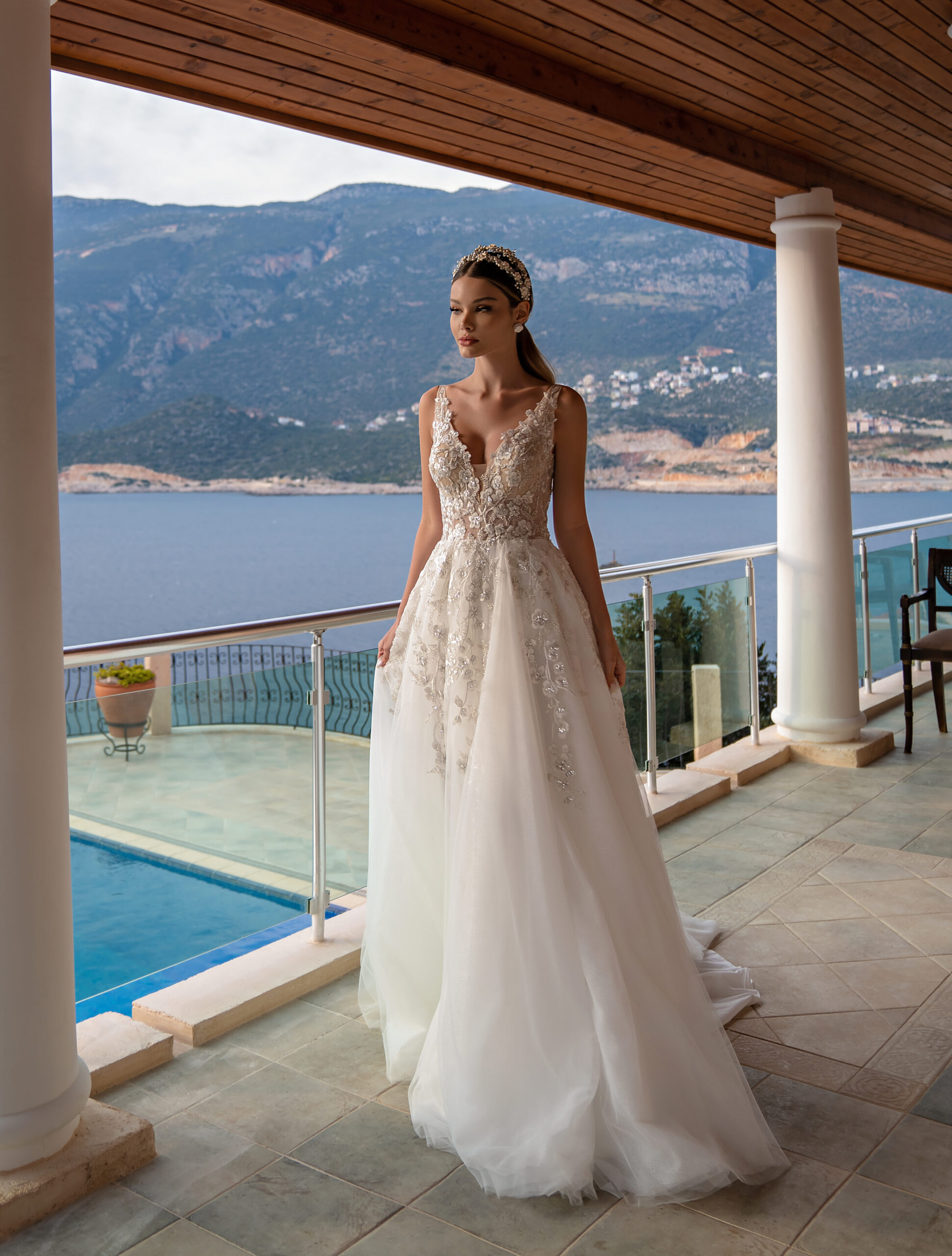 A light wedding dress on the straps with a soft skirt with a train. A seductive translucent bodice to the waist is decorated with a deep neckline in front. A graceful back is emphasized by a V-neck. The model is decorated with guipure, embroidered with silver beads and sequin.