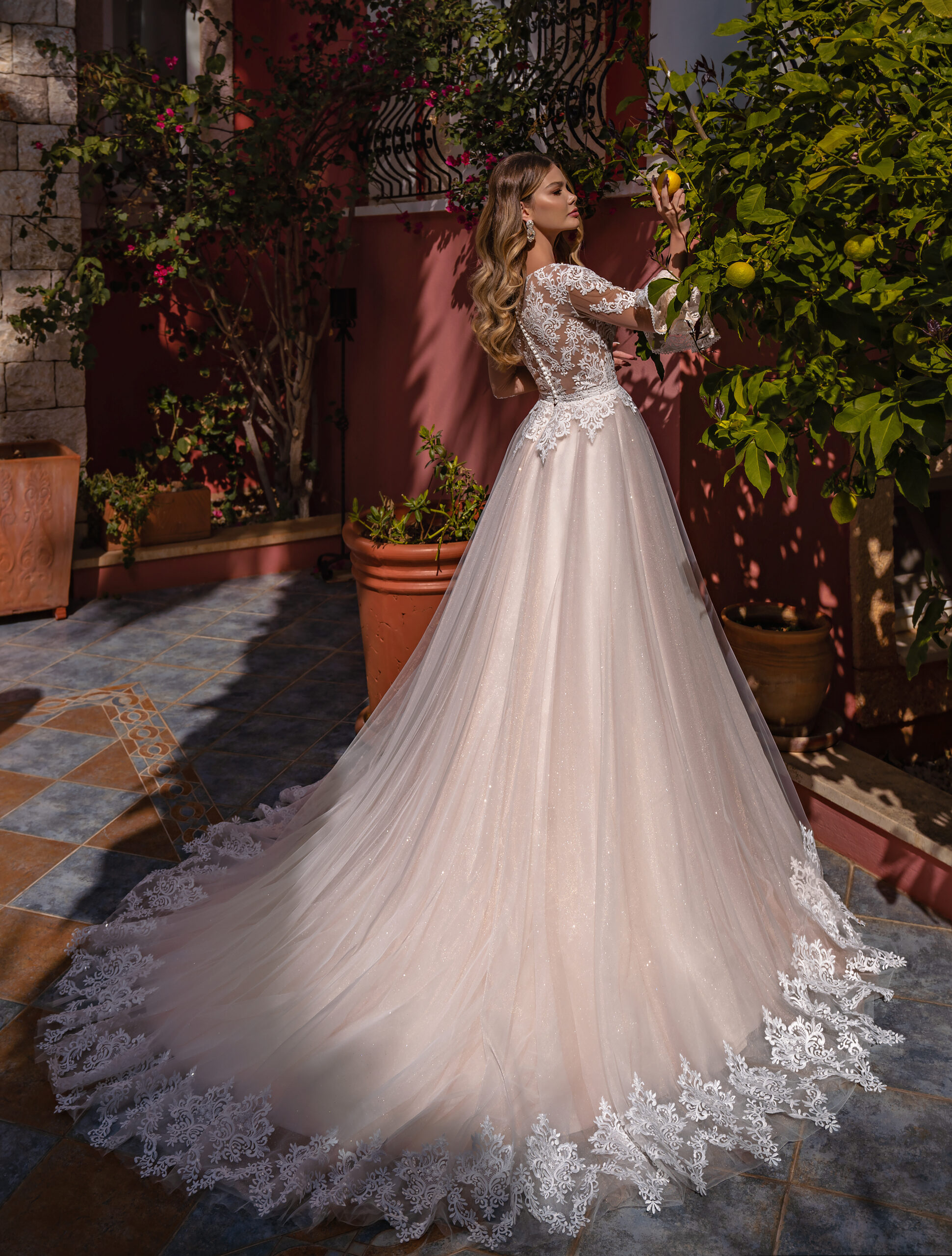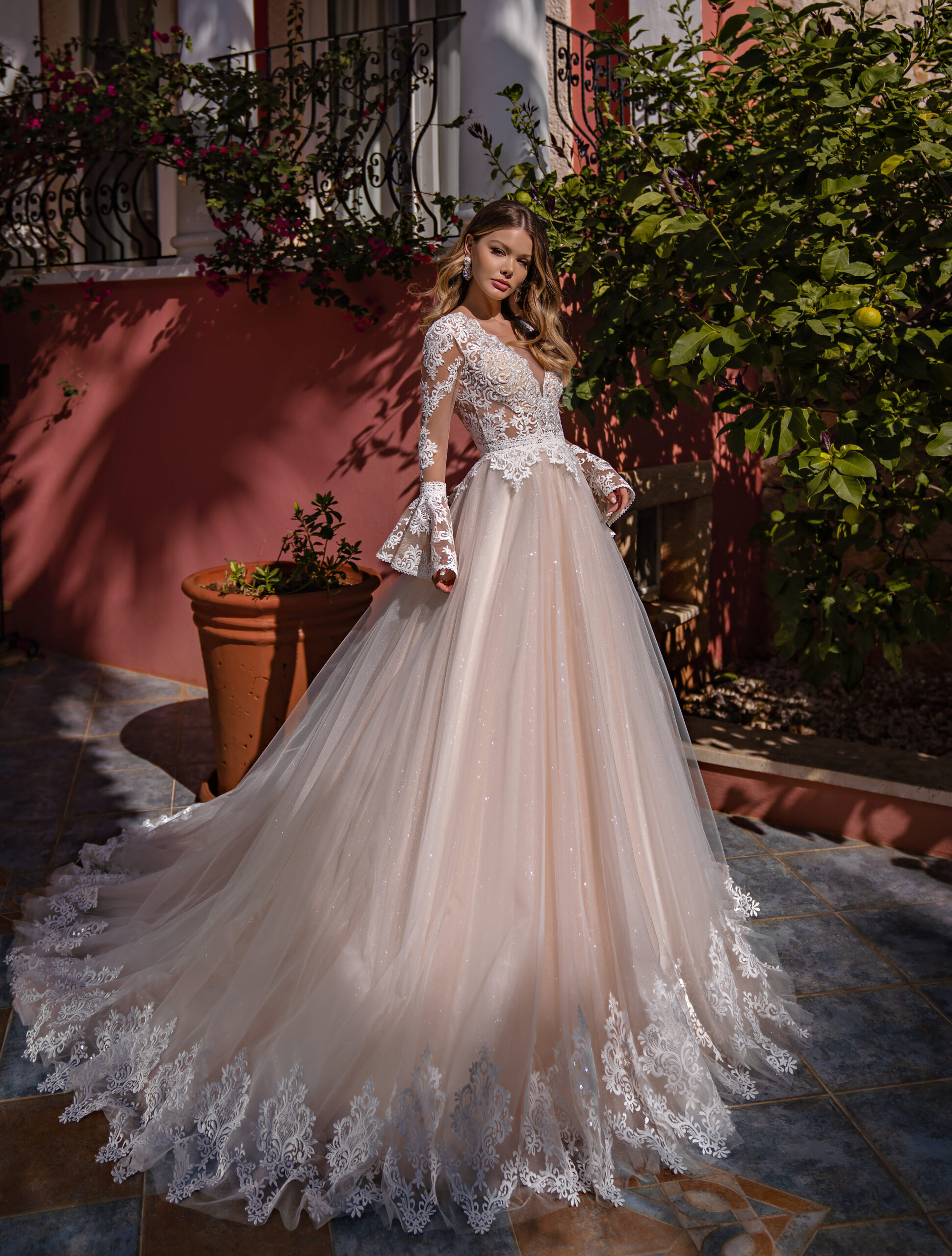 A sophisticated wedding dress with long flared sleeves and a soft fluffy skirt with a train. The model is made on nude lining, which seems to set off the guipure. The bodice in front is decorated with imitation of a deep neckline. Original flared sleeves add delicacy to the look. A fluffy skirt with a spectacular light shiny fabric on the bottom is decorated with a luxurious guipure coupon. The model is decorated with lace and guipure elements with sequin.