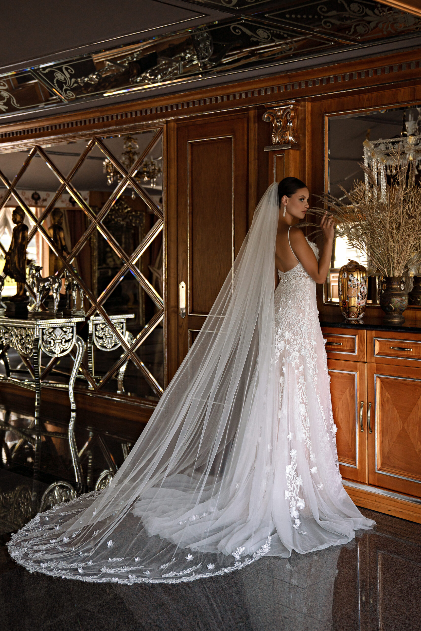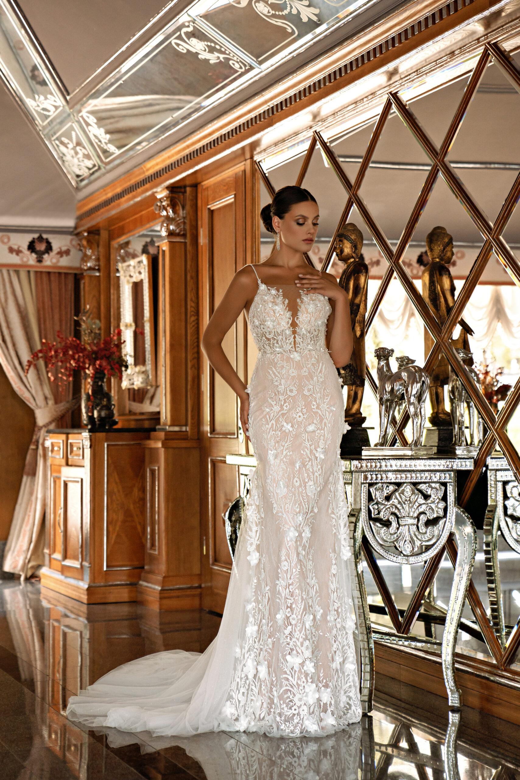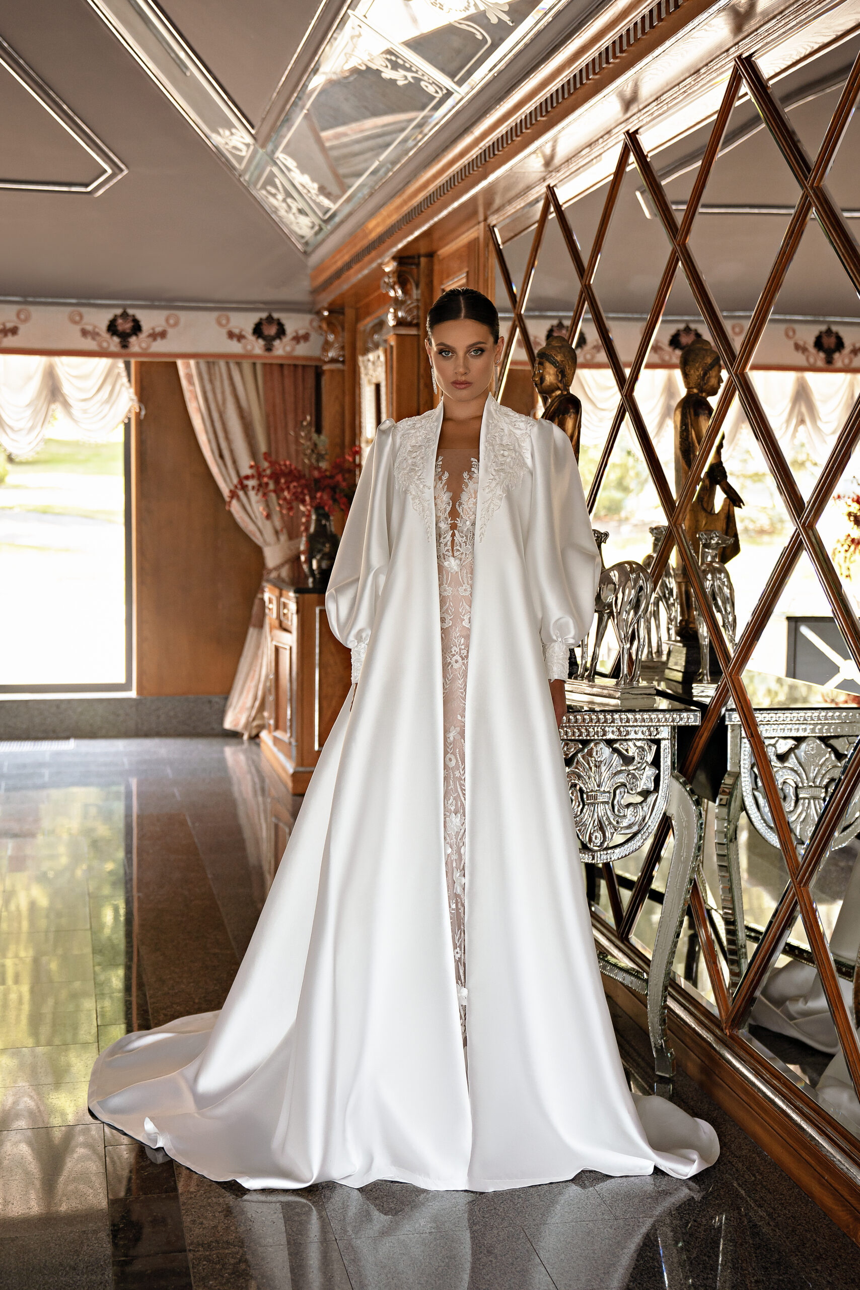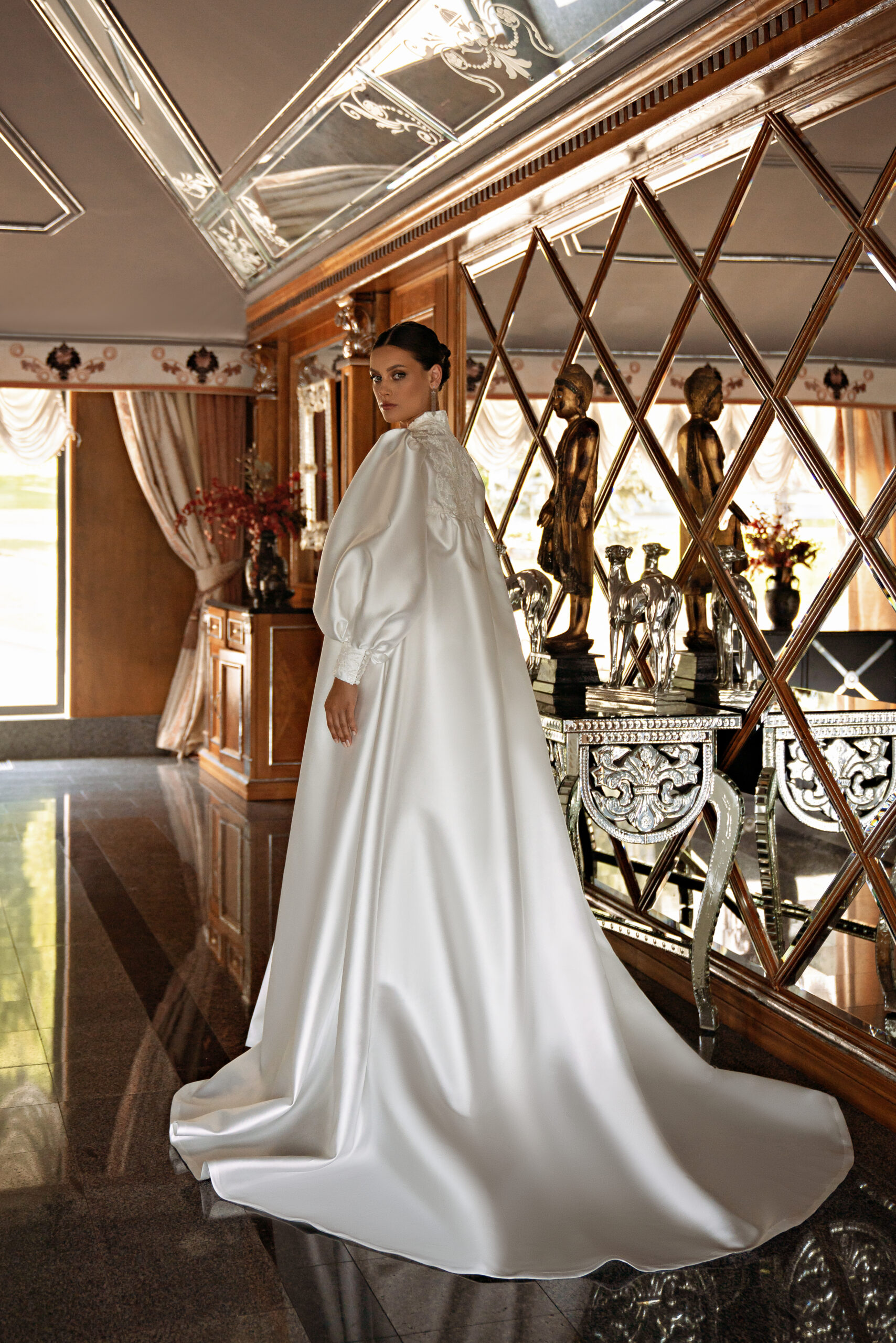 An extraordinary wedding dress with a detachable cape is a true masterpiece of bridal fashion that combines luxury and elegance. A dress with thin straps and a train skirt is designed to make the bride look charming and captivating. The semi-transparent bodice adds tenderness to the image, and the deep cut in the front gives the dress mystery. A body-hugging model that favourably shades the lace. The lace, embroidered with sequins and beads, decorates the dress skilfully, adding shine and radiance. A special accent are the voluminous flowers of different sizes, located throughout the dress, which give the image of romance and tenderness. This incredible look is complemented by a detachable cape in luxurious mikado fabric, which has puffy buttoned sleeves. This cloak gives an image of splendour and majesty, making the bride look like a real princess.