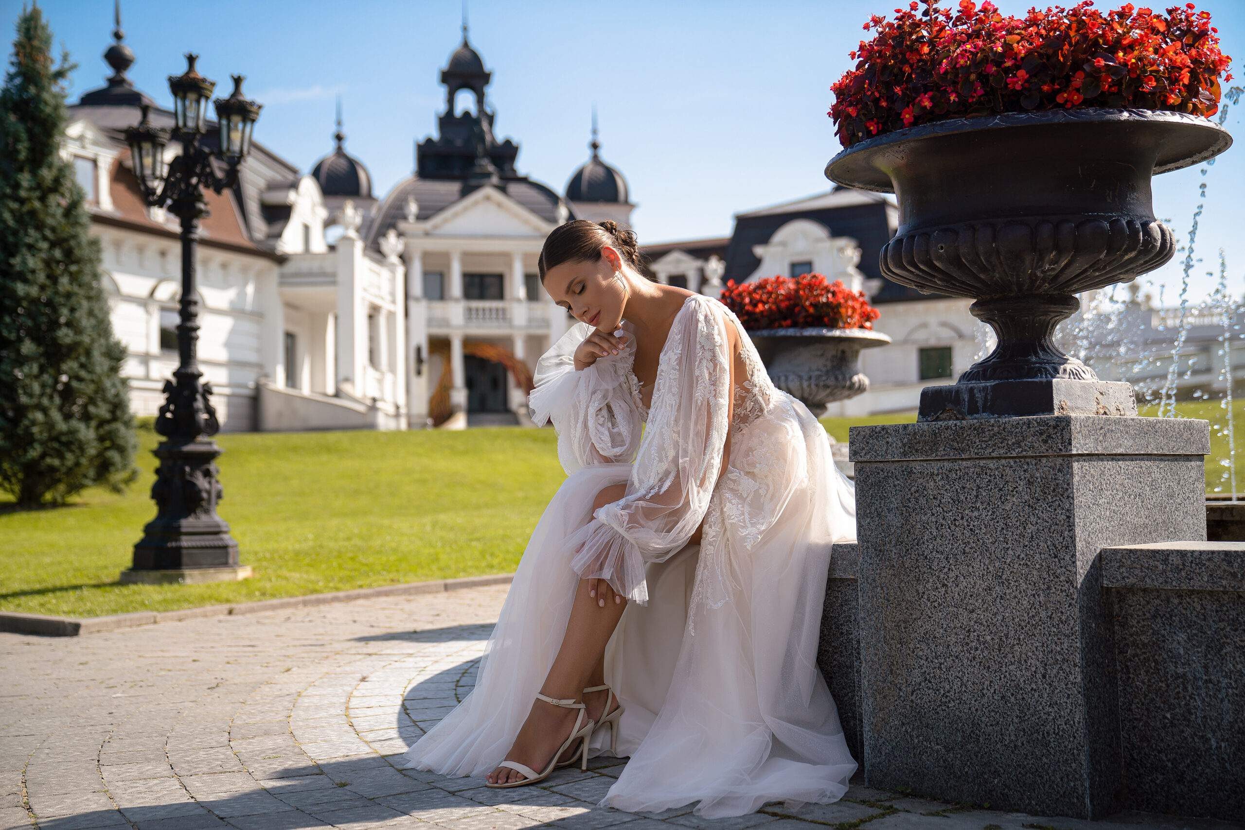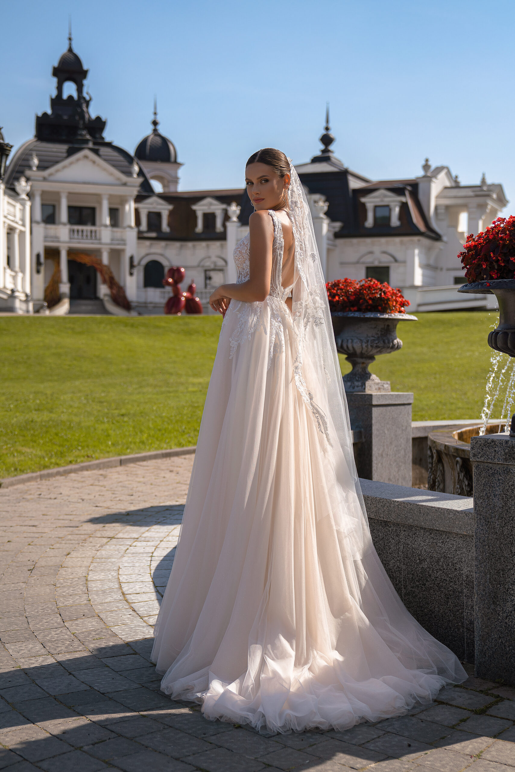 An incredible wedding dress can amaze with its elegance and radiance on the most important day in the life of every bride. It combines luxury and style, creating a unique look that will captivate everyone. The dress has long sleeves, giving the image mystery and tenderness. A skirt with a train makes this look sophisticated and luxurious, giving the bride a royal look. The nude cups of the dress are decorated with lace, which adds sophistication and supports the shape of the bust. The front of the dress has a deep neckline that attracts attention and creates a mysterious emphasis on the neckline. The back of the dress is fastened with elegant buttons, which add a finishing touch to the look and emphasize its sophistication. The piece also features lace, beading, and sequins for a sparkly and sophisticated effect. This dress amazes with its beauty and details that give the image unsurpassed elegance and charm.