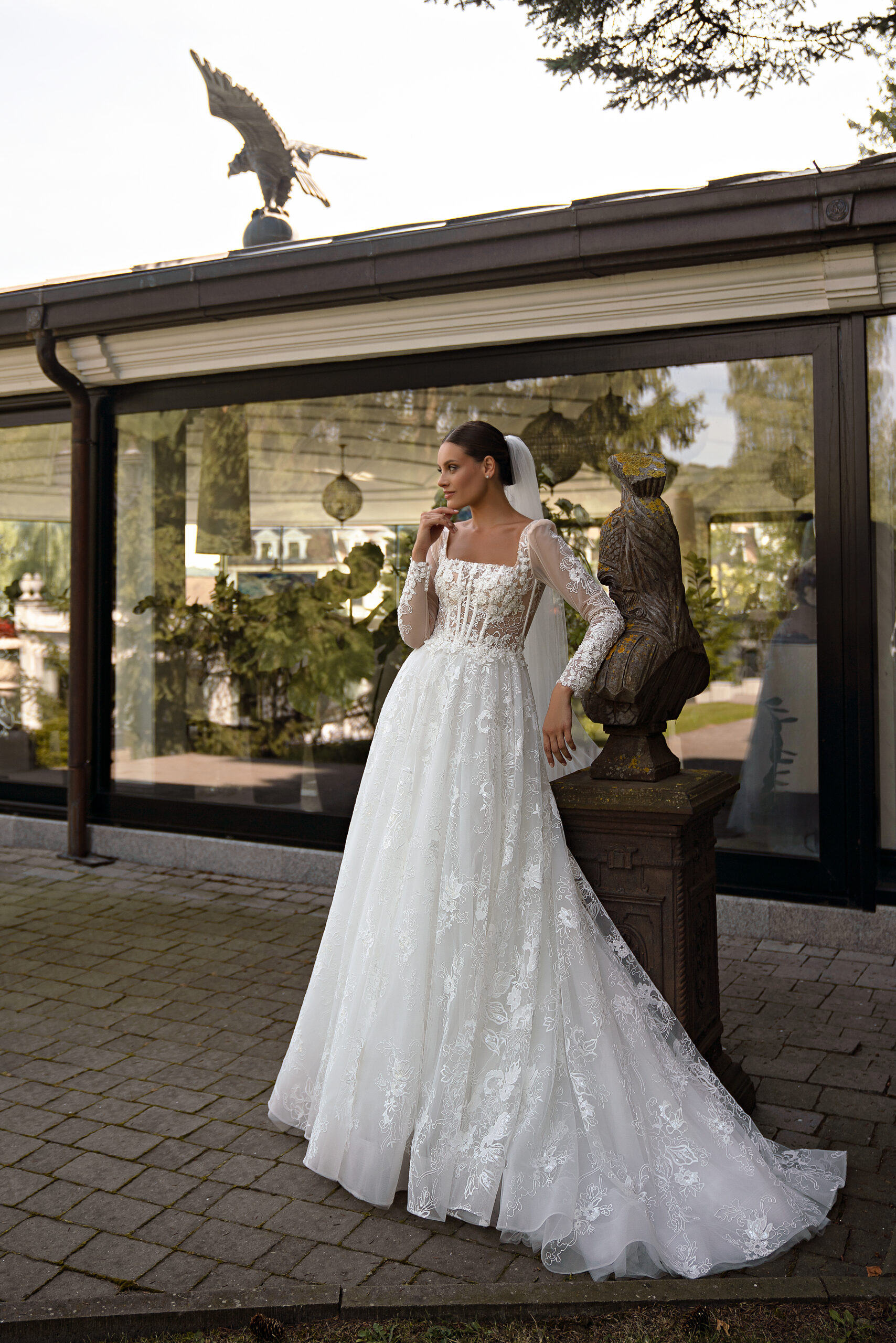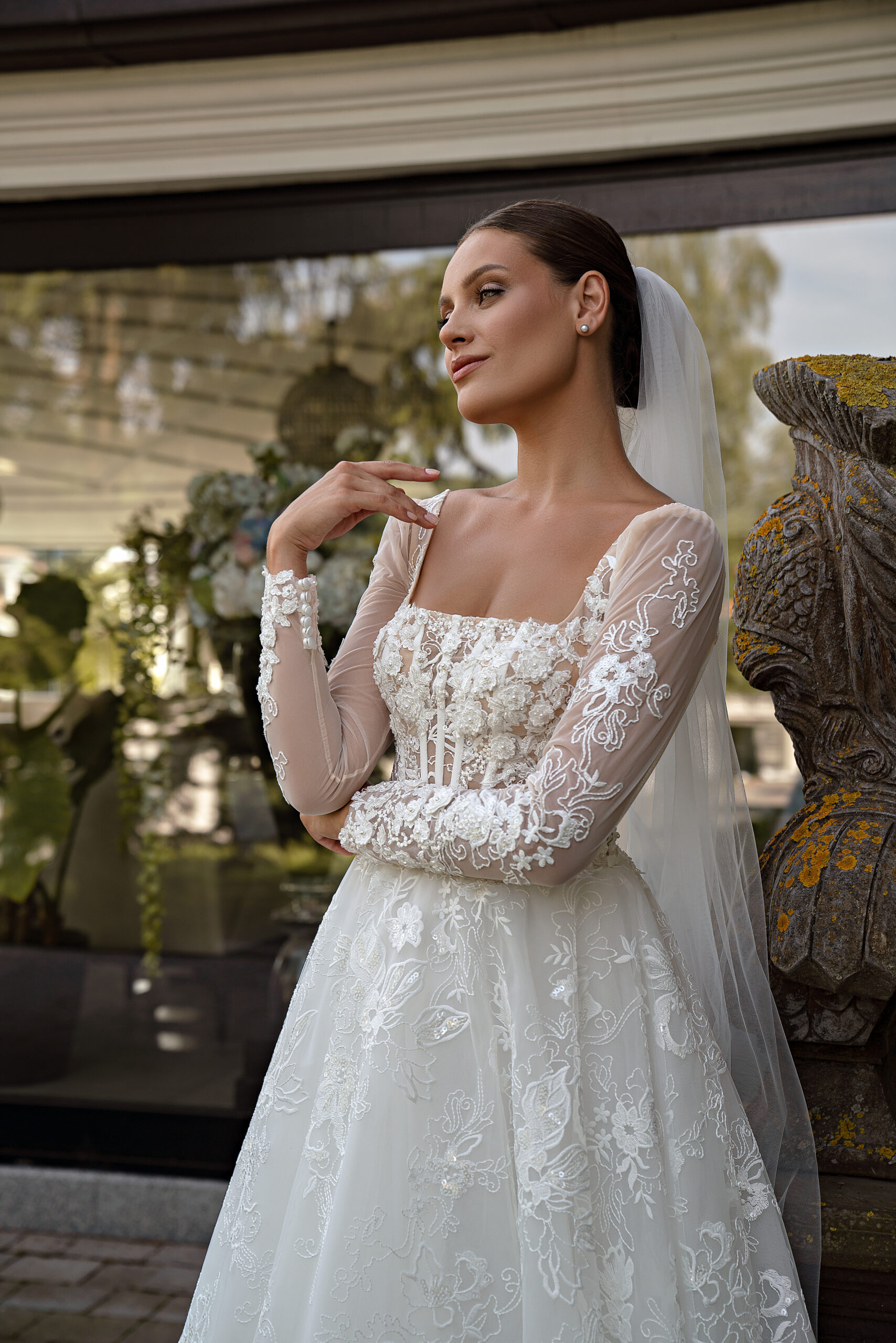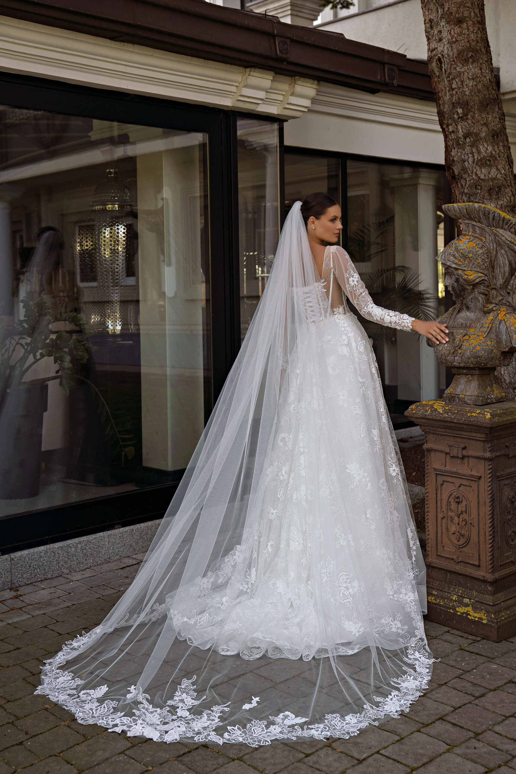 This luxurious wedding dress is the epitome of elegance and romance for the bride who wants to look fabulous on her big day. The dress has long sleeves and a voluminous skirt with a train, which makes it look strikingly romantic and extremely sophisticated. The main material for creating this model is lace, which is known for its delicacy and sophistication. The lace is embroidered with sequins, which give the dress a shine and radiance, making it especially fascinating. A semi-transparent corset to the waist perfectly keeps the shape and emphasizes the feminine lines of the figure. This corset adds elegance and grace to the image. The back of the dress is laced, which will allow you to perfectly fit the dress to the figure. The model is skillfully decorated with voluminous lace, embroidered with pearls, beads and sequins, which creates a rich and luxurious visual effect. These details give the dress unparalleled beauty and shine.