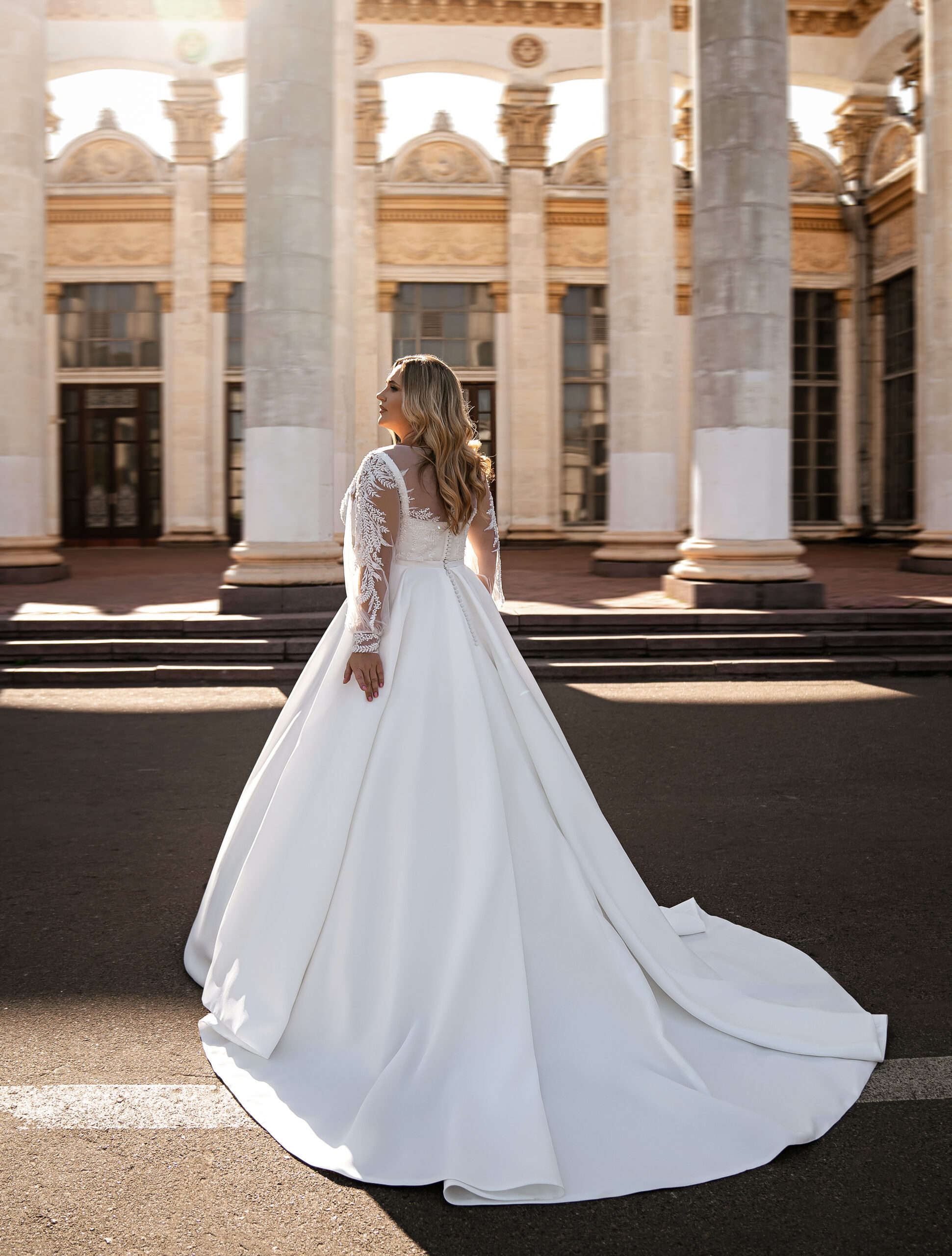 A minimalist wedding dress that has a removable bolero decorated with appliqués, embroidered sequins and pearls. Without a bolero, the dress has a simple and modern look. Complemented by pockets that are accentuated by appliqués. The skirt is made of luxurious textured fabric.