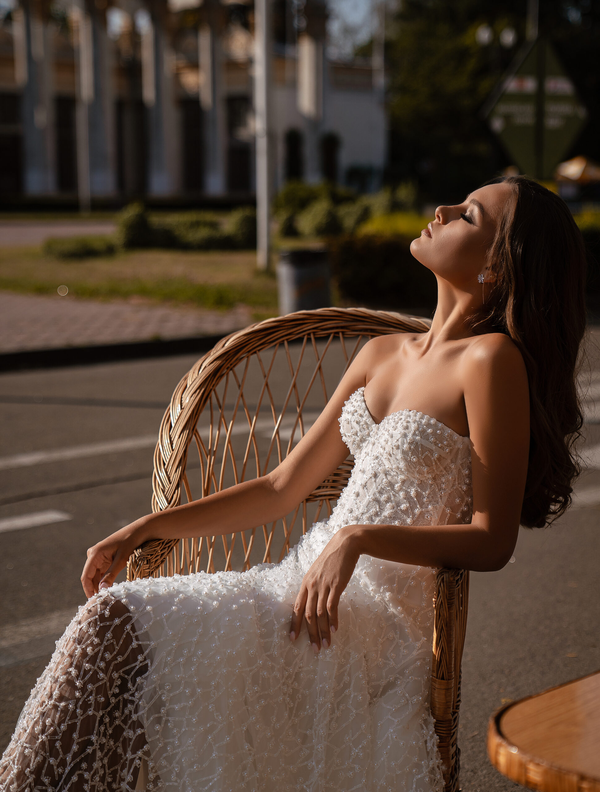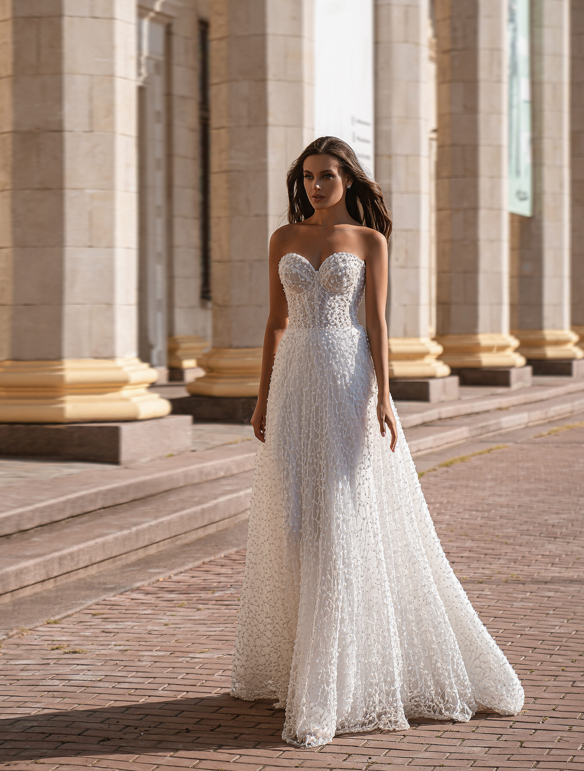 Wedding dress “A”-silhouette, with a beautiful heart neckline. This model has one removable wing sleeve, which gives the dress a special, unique look. Shimmering guipure embroidered with beads and pearls adorns the dress, giving it luxury. The back is complemented by lacing that emphasizes the waist