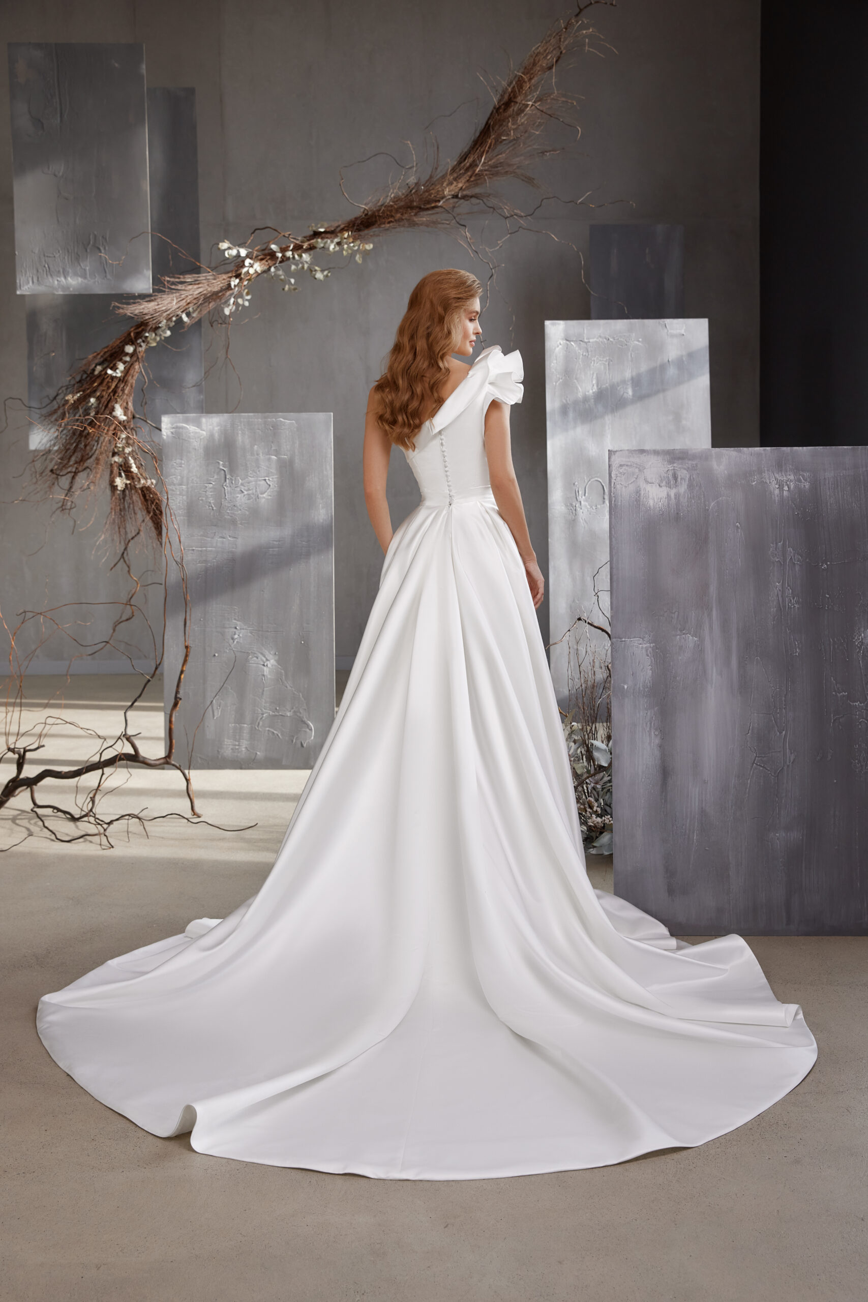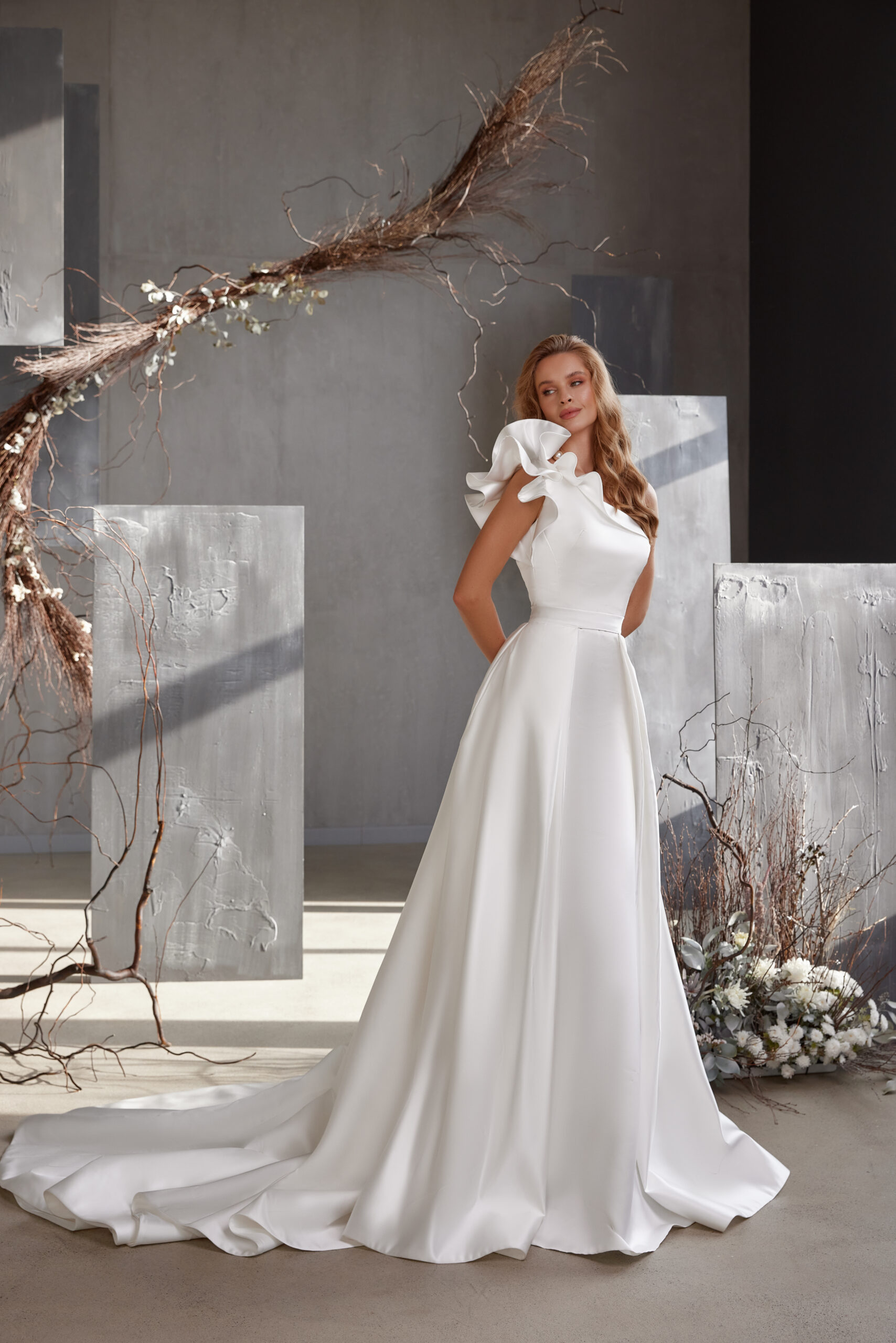 Gorgeous bridal set, consisting of a “minimalism” style godet dress and a detachable train. The model is made of satin material, which looks very expensive and incredibly beautiful, adding femininity to the wedding dress, especially in the combination of our fashion designer’s secrets. An asymmetric corset to the waist is decorated with a spectacular ruffle collar on one shoulder. Offset reliefs along give the look a zest. Detachable train at the waist, which fastens with buttons and adds variety to the look.