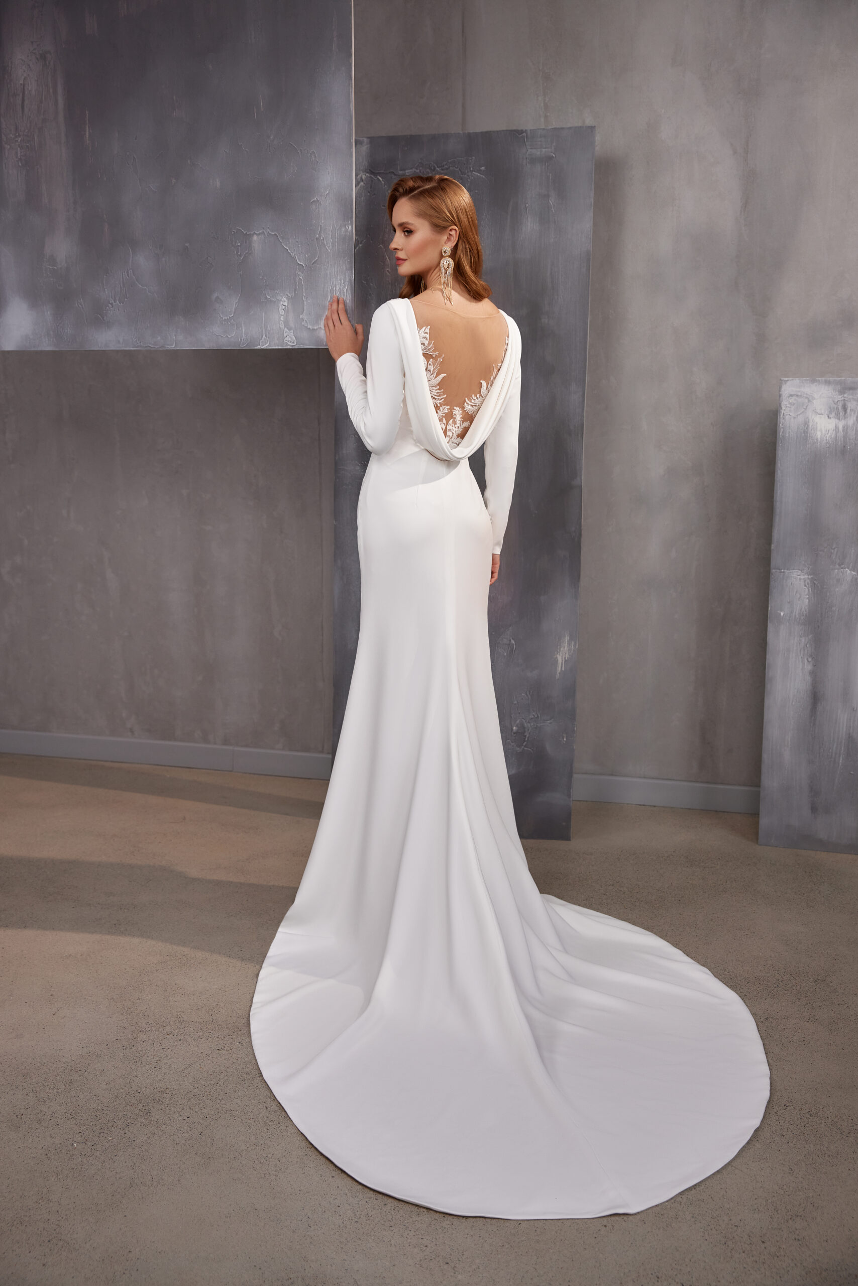 Stunning wedding dress made of excellent material – stretch crepe, which fits amazingly beautifully on the woman’s figure. From the front, the model with long sleeves and a “boat” neckline looks quite modest and minimalistic. But an amazing textured element on the back, with details of guipure, embroidered with beads and sequins, embellished on a bodily yoke and falling drapery, turns the dress into a real masterpiece and creates a very spectacular and extravagant luxurious look.