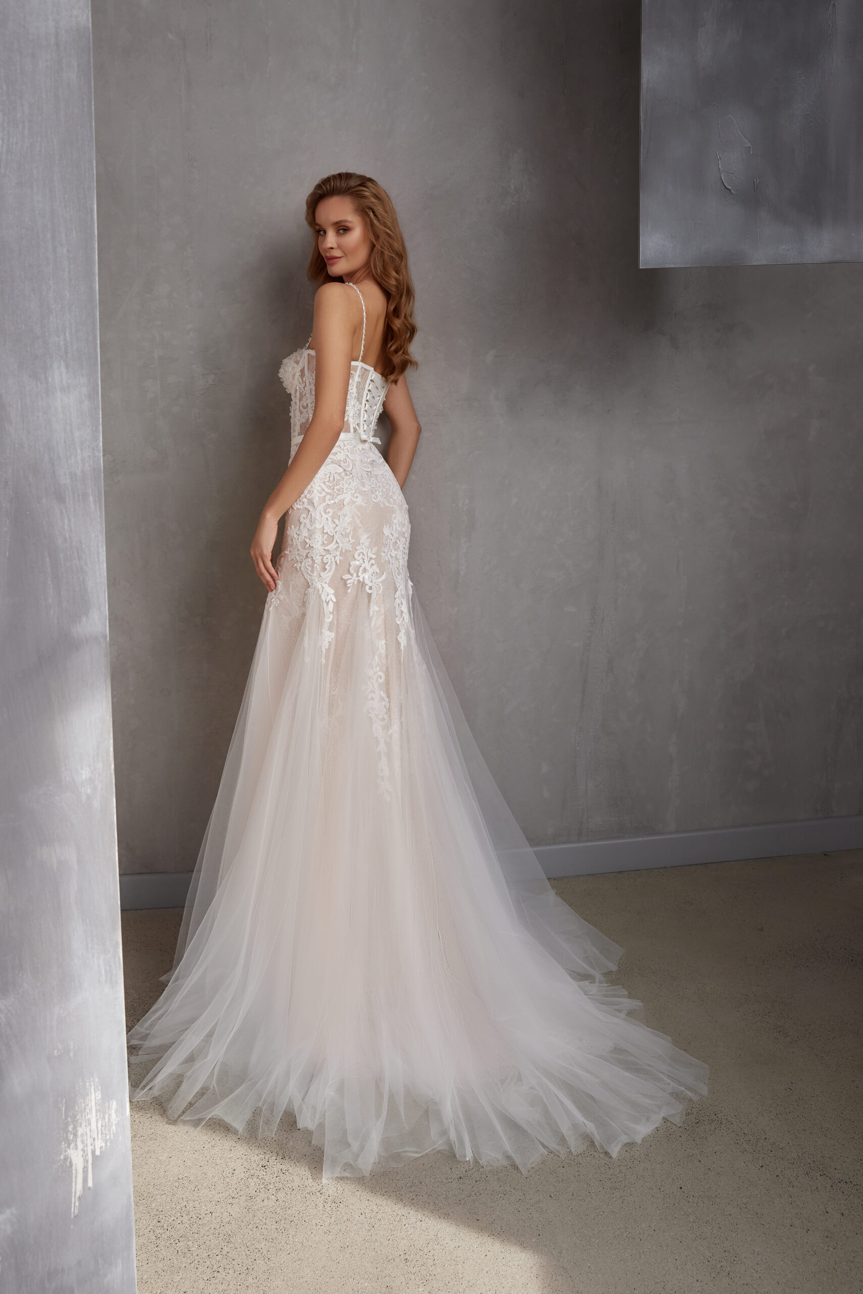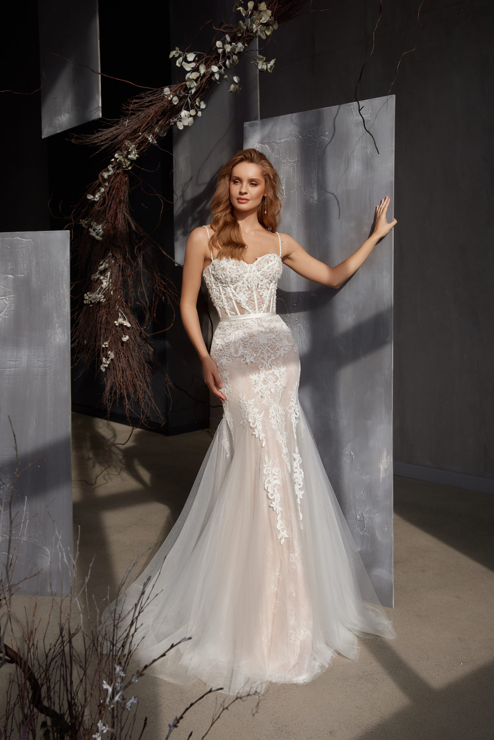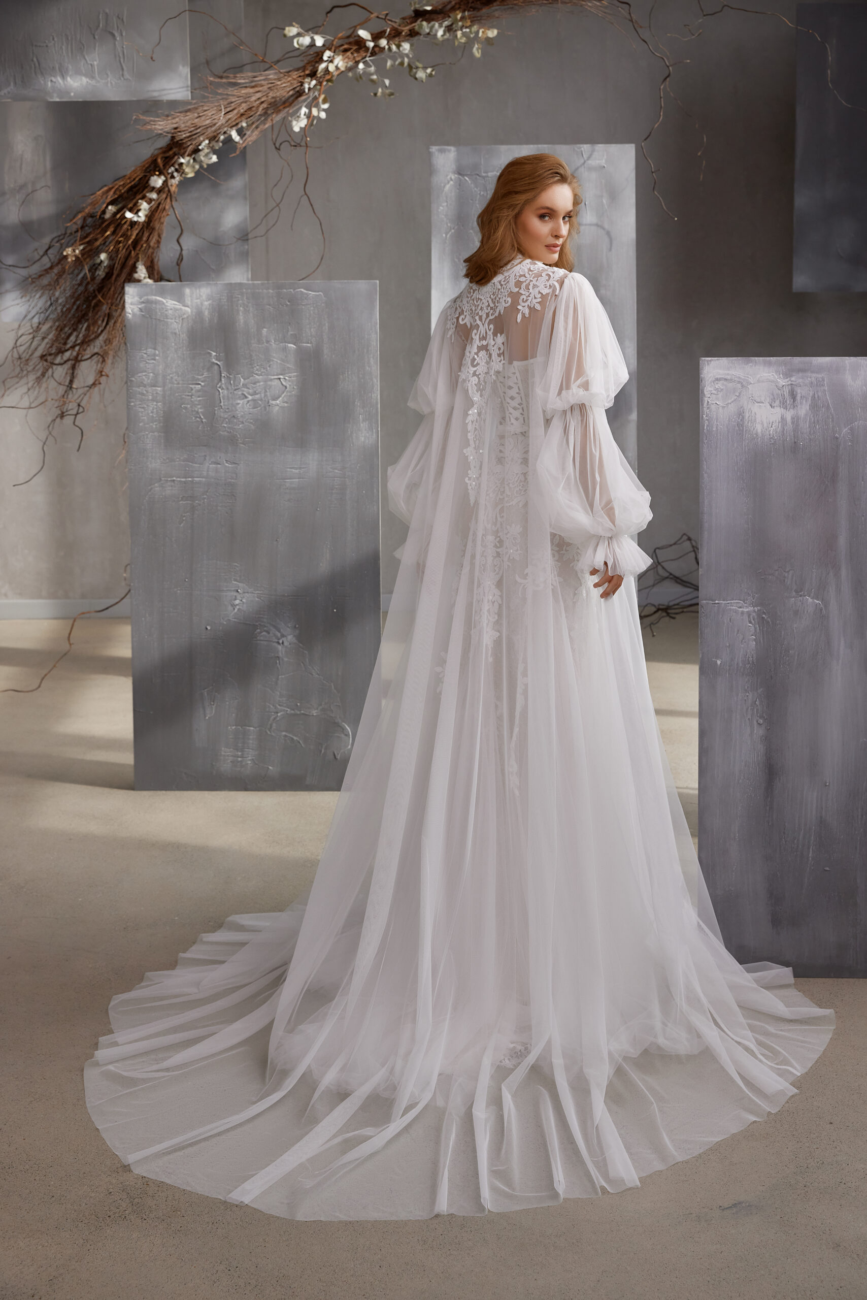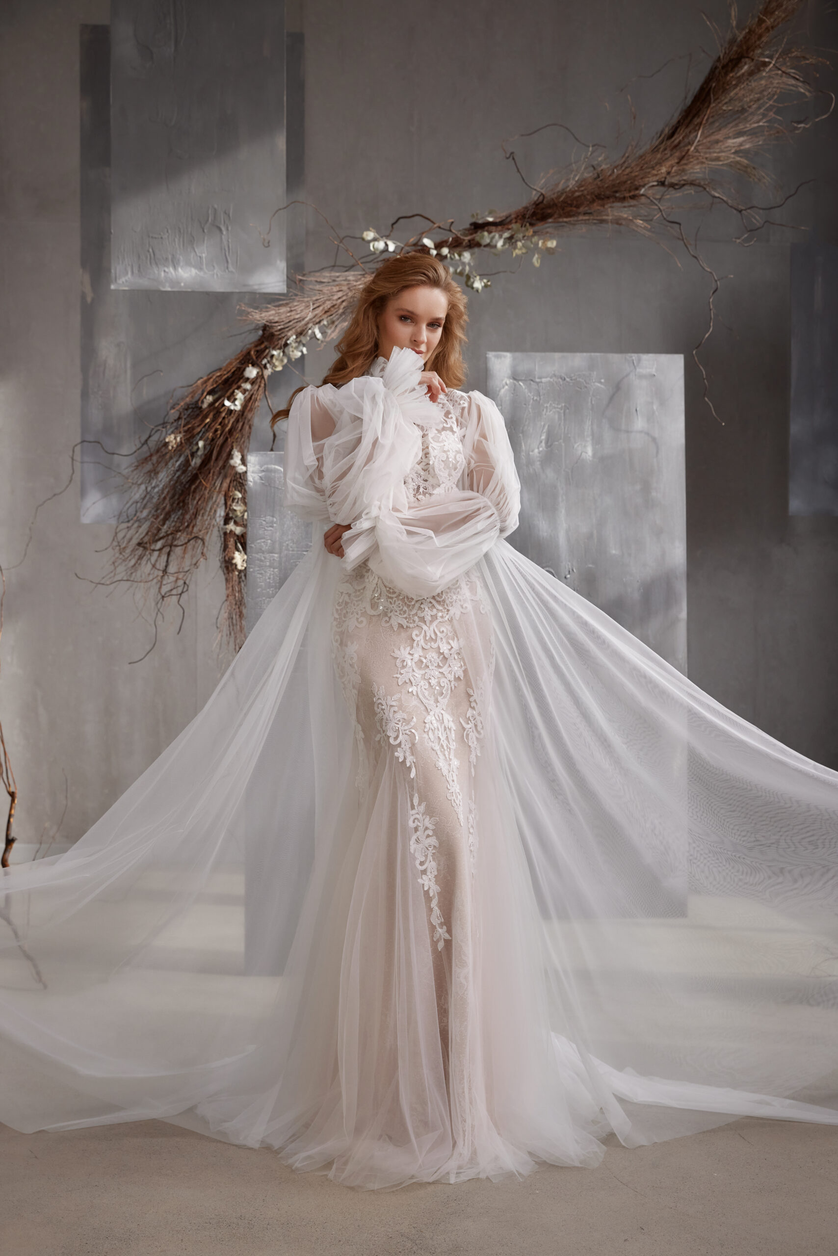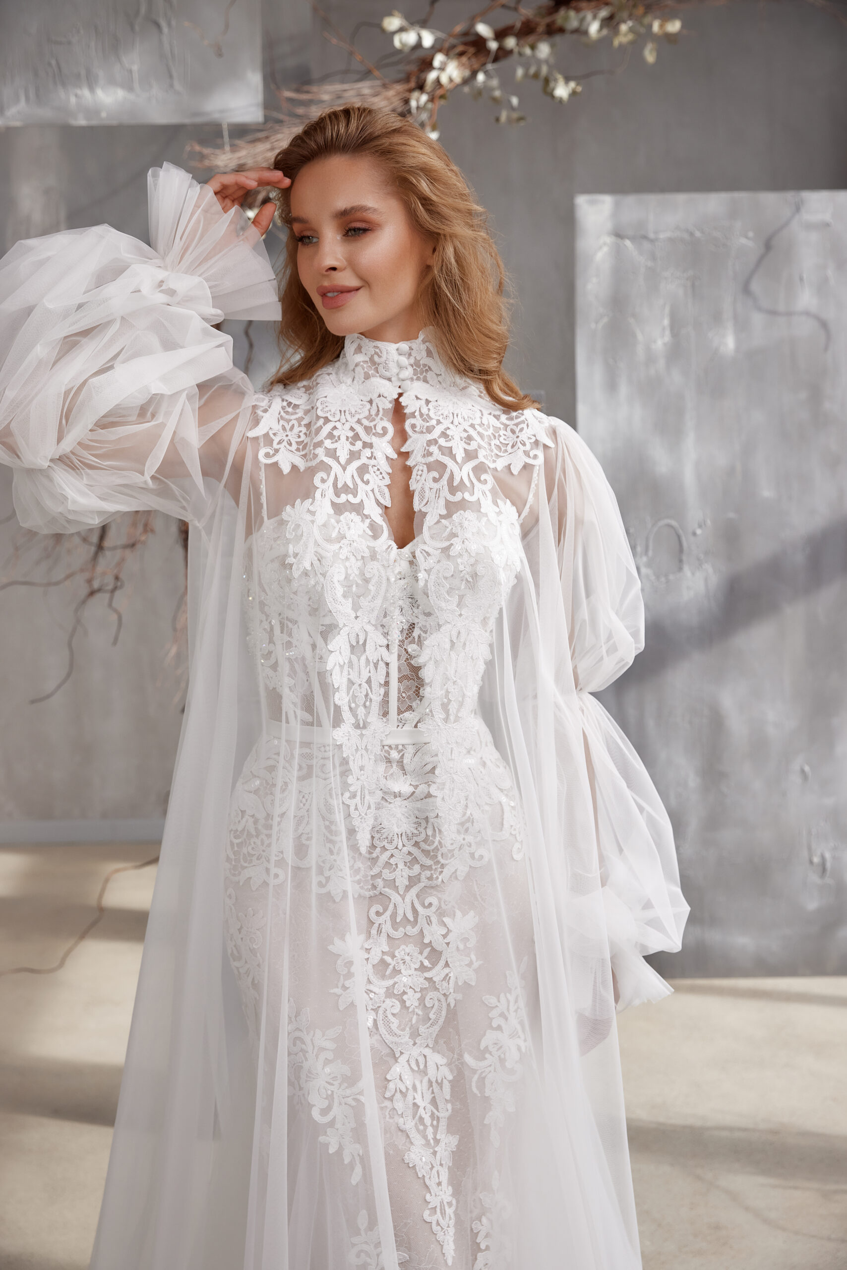 A beautiful wedding set consisting of a graceful mermaid dress and a magnificent long-sleeved detachable cloak. The dress is made on a nude base covered with openwork Chandelier lace “lily” and a layer of delicate dot mesh. The corset to the waist is delicately stitched with a velvet ribbon, which gives the model a zest. The waist is accentuated by a minimalistic thin belt made of satin. Spectacular skirt with a train and sewn-in wedges made of euro mesh. The detachable cloak is complemented by puffed sleeves and a stand-up collar for a completely new look and regal grandeur. The model is decorated with guipure with a cord embroidered with sequins, embroidered with crystal along the corset.