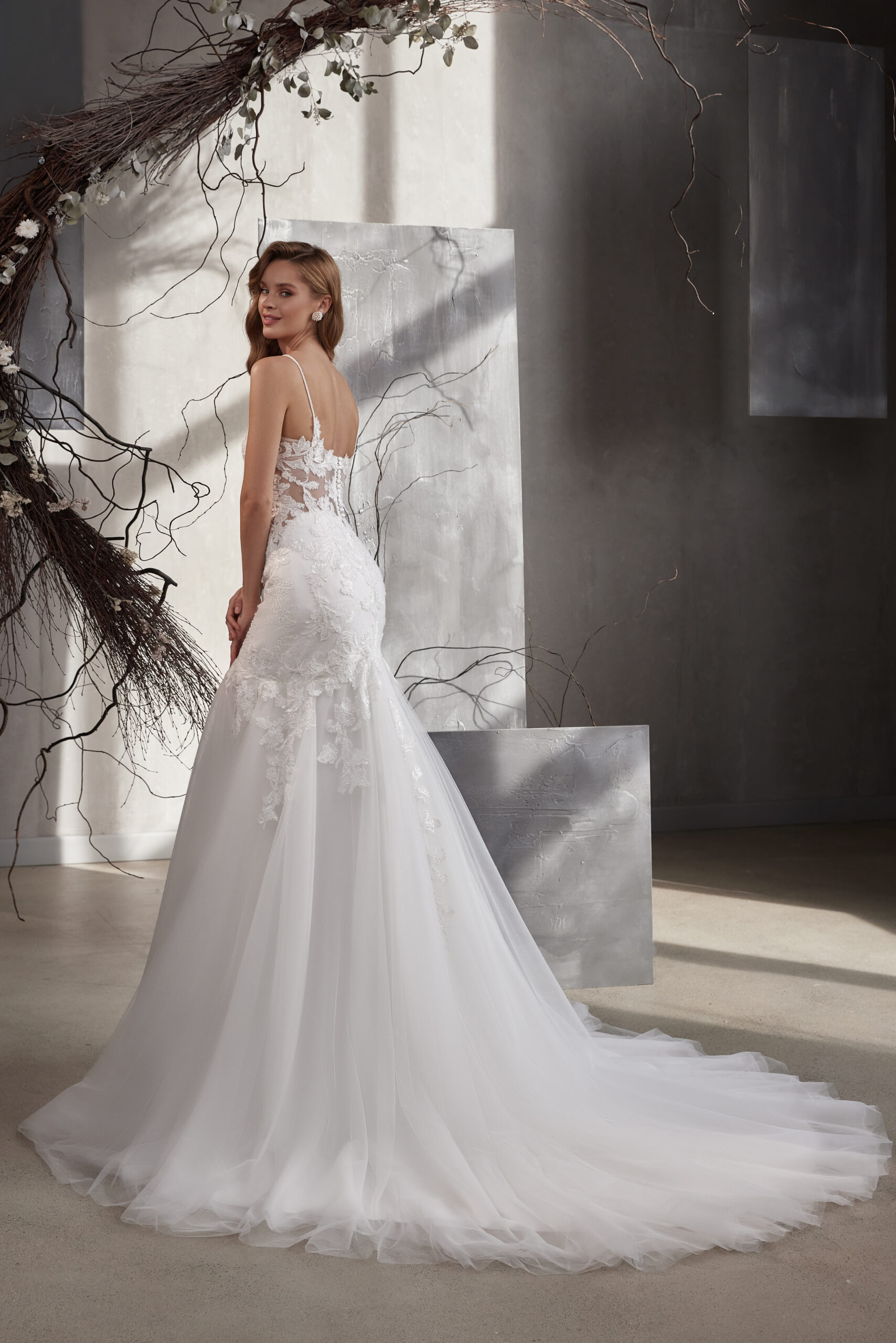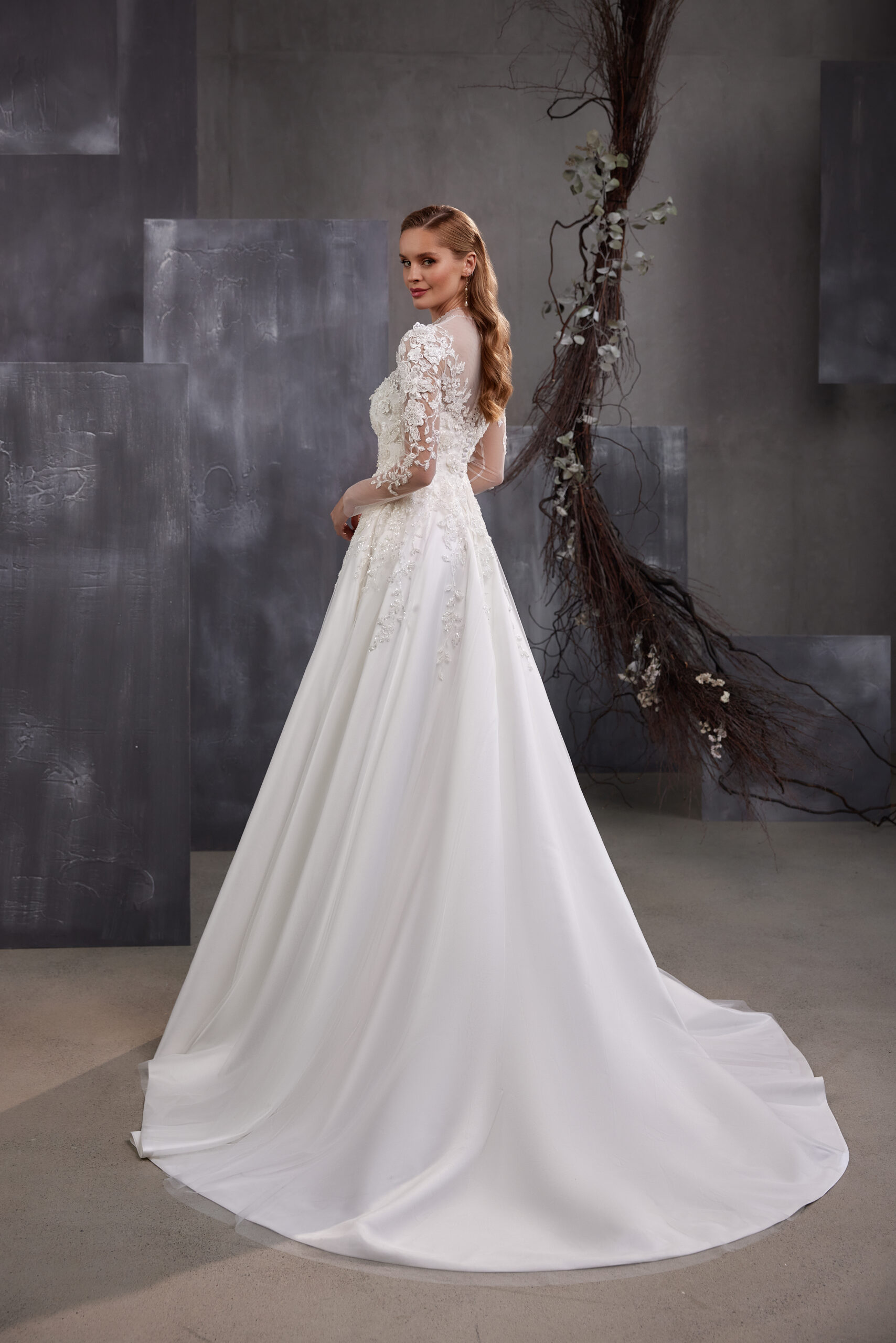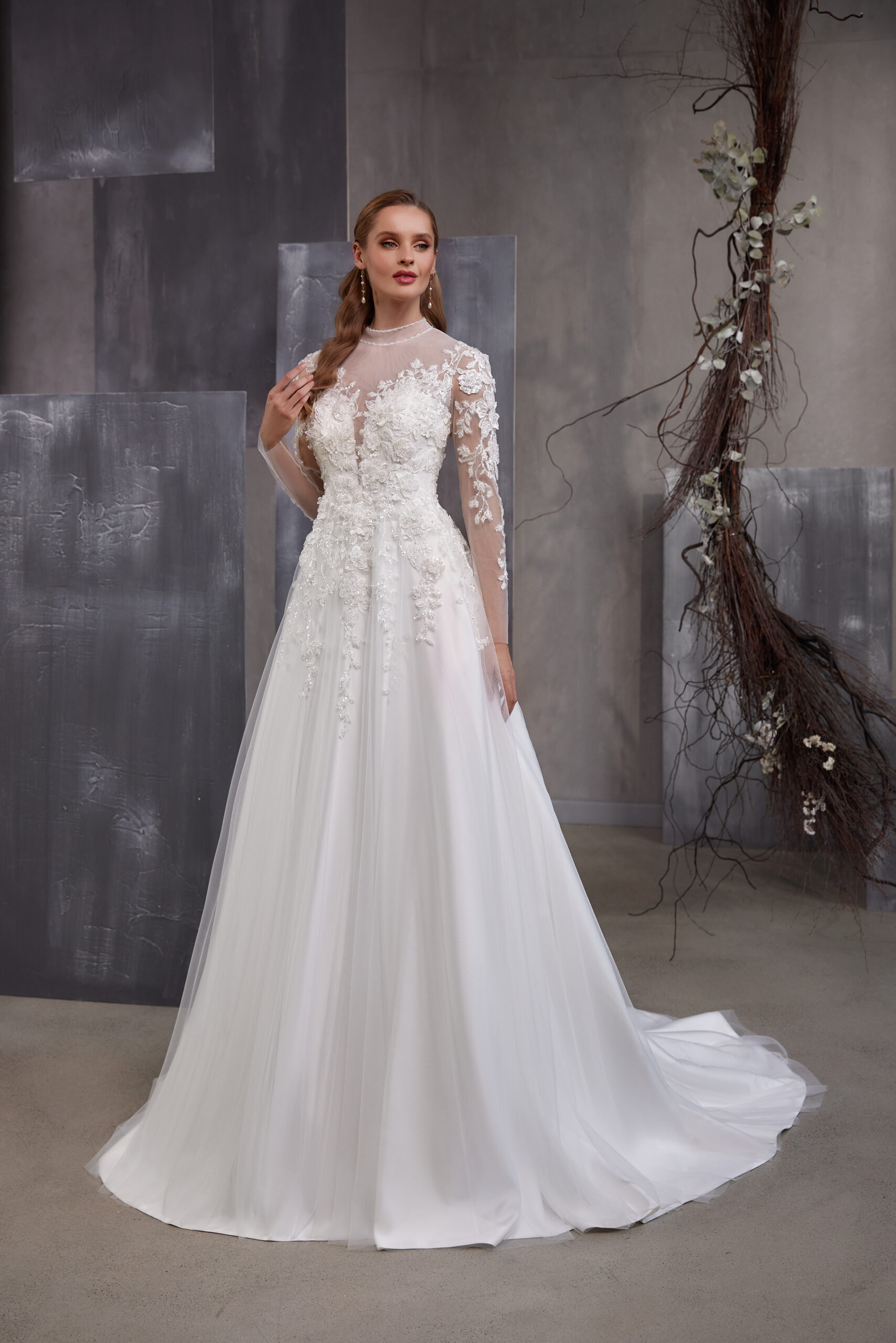 Beautiful transforming wedding dress, consisting of a “minimalism” style dress with a removable belt with a bow and a removable translucent dress made of euro mesh with long sleeves and a stand-up collar. In a satin dress, the shoulders are subtly open and the skirt is complemented by a luxurious train. Corset to the waist with seductive imitation of a deep neckline in the front, and an elegant lacing in the back. The skirt has pockets for brides who love comfort and practicality. The removable top dress is decorated with elements of guipure embroidered with sequins and beads and 3D guipure, also embroidered with beads, pearls, crystal and sequins, which in general makes the model very charming