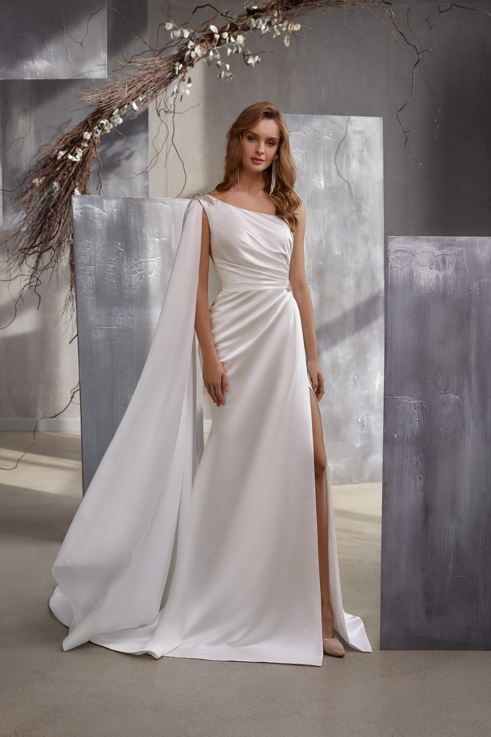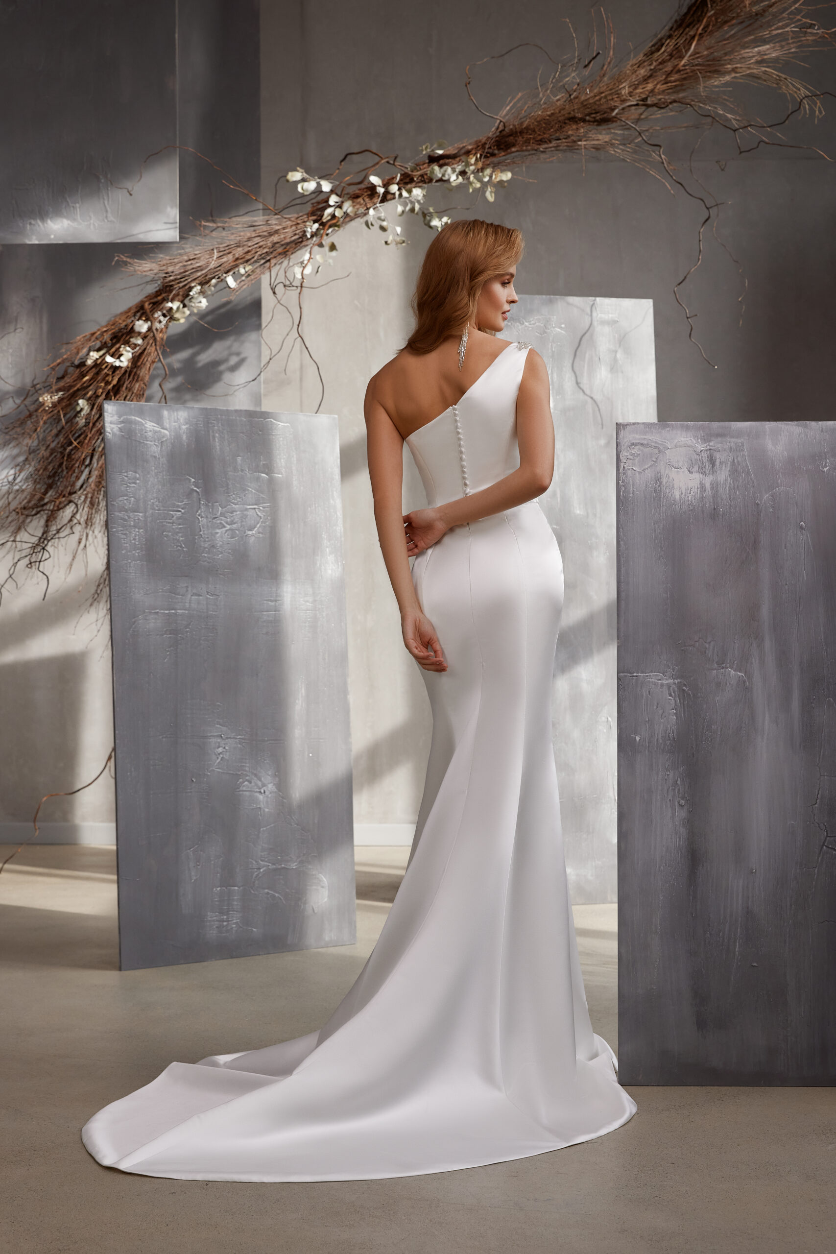 Exquisite wedding dress of “minimalism” style, made of satin fabric with a luxurious matte sheen, looks perfect in the “godet” silhouette and is decorated with many draped elements. An asymmetric corset to the waist attracts the eye with the original drapery, which can be complemented by a removable element on one shoulder, which gives the image extravagance. The back is fastened with a series of handmade buttons. The skirt with a train has a wraparound front, where the upper part is draped with pleats. The removable elemental shoulder also with an opposite pleat along the collar. The model is decorated with elements embroidered with stone, sequins, and silver beads.