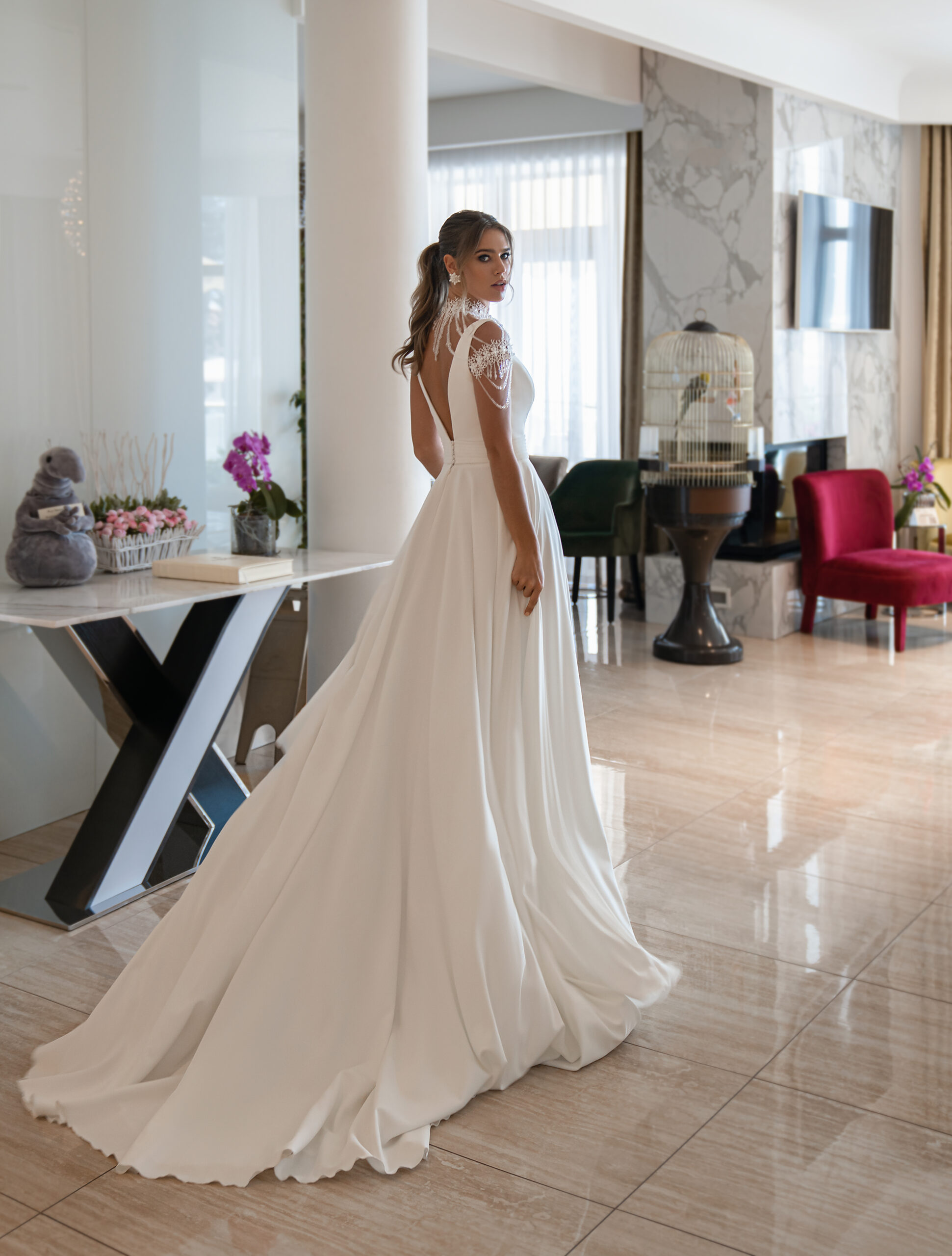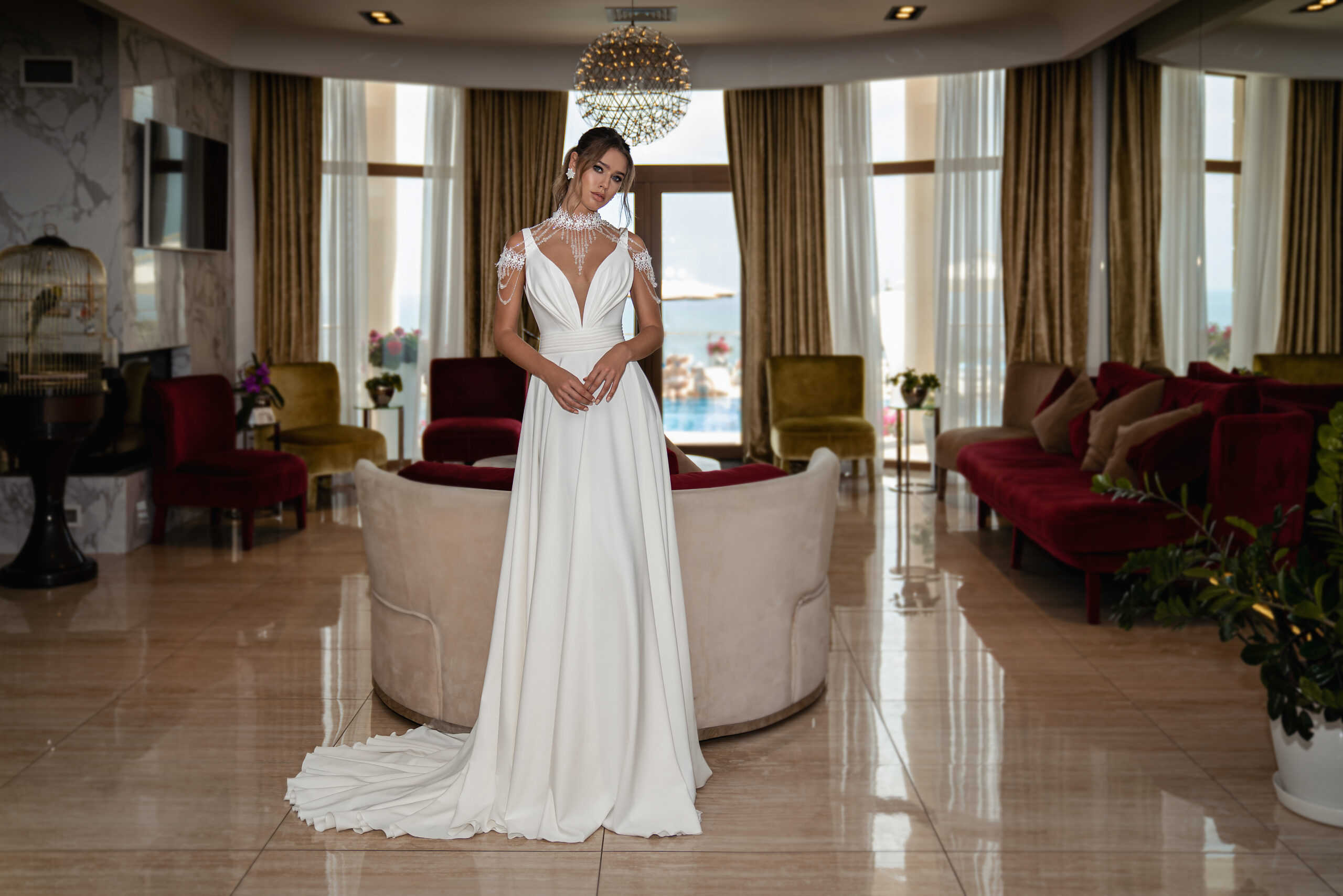 A wonderful wedding dress with straps with a soft skirt with a train. Polished crepe gives a special charm to the model. The corset to the waist is decorated with a deep curly neckline in the front and back. The dress is decorated with graceful drapery. As a décor, jewelry is used – a necklace made of boho lace and crystal, which gives the image a special look.