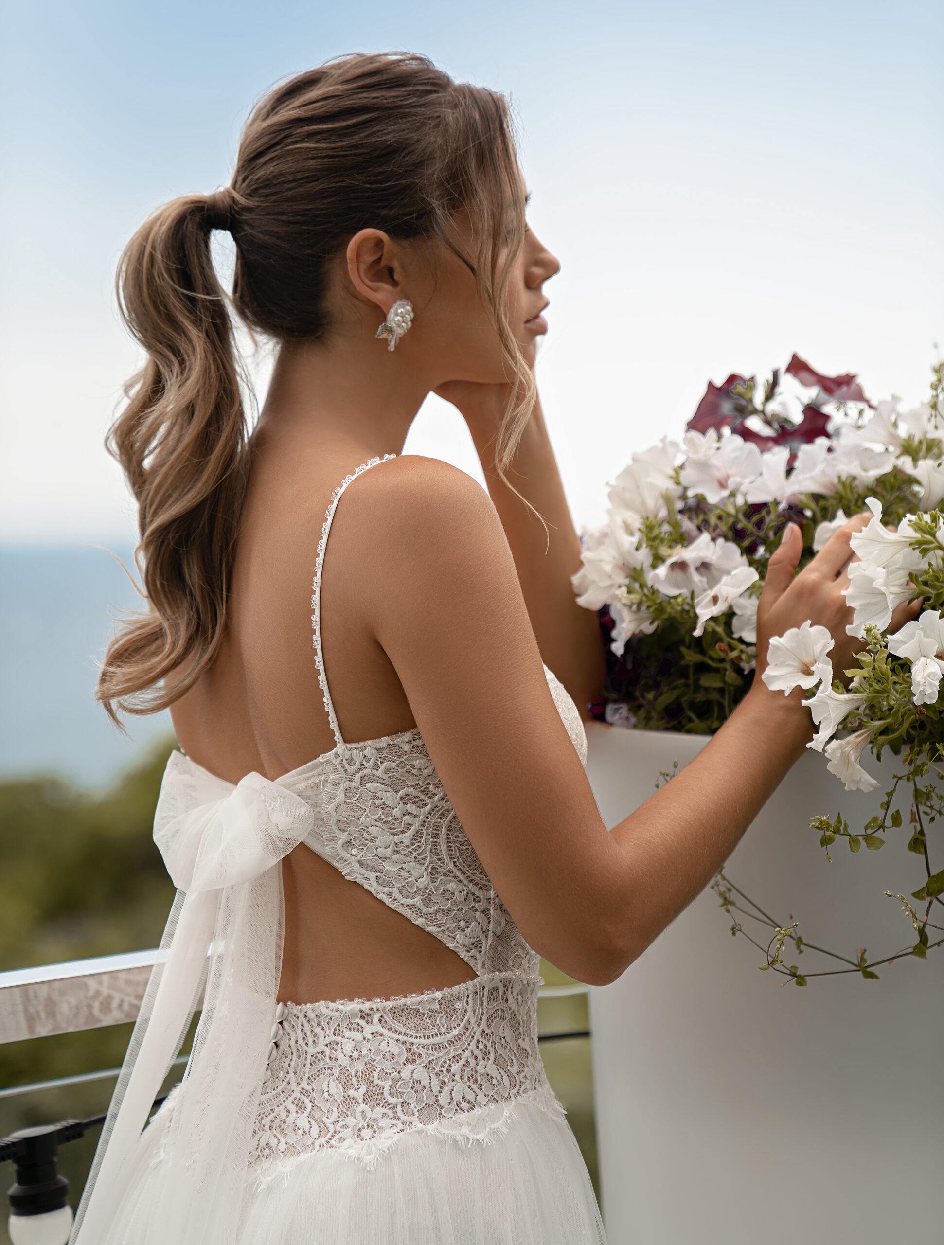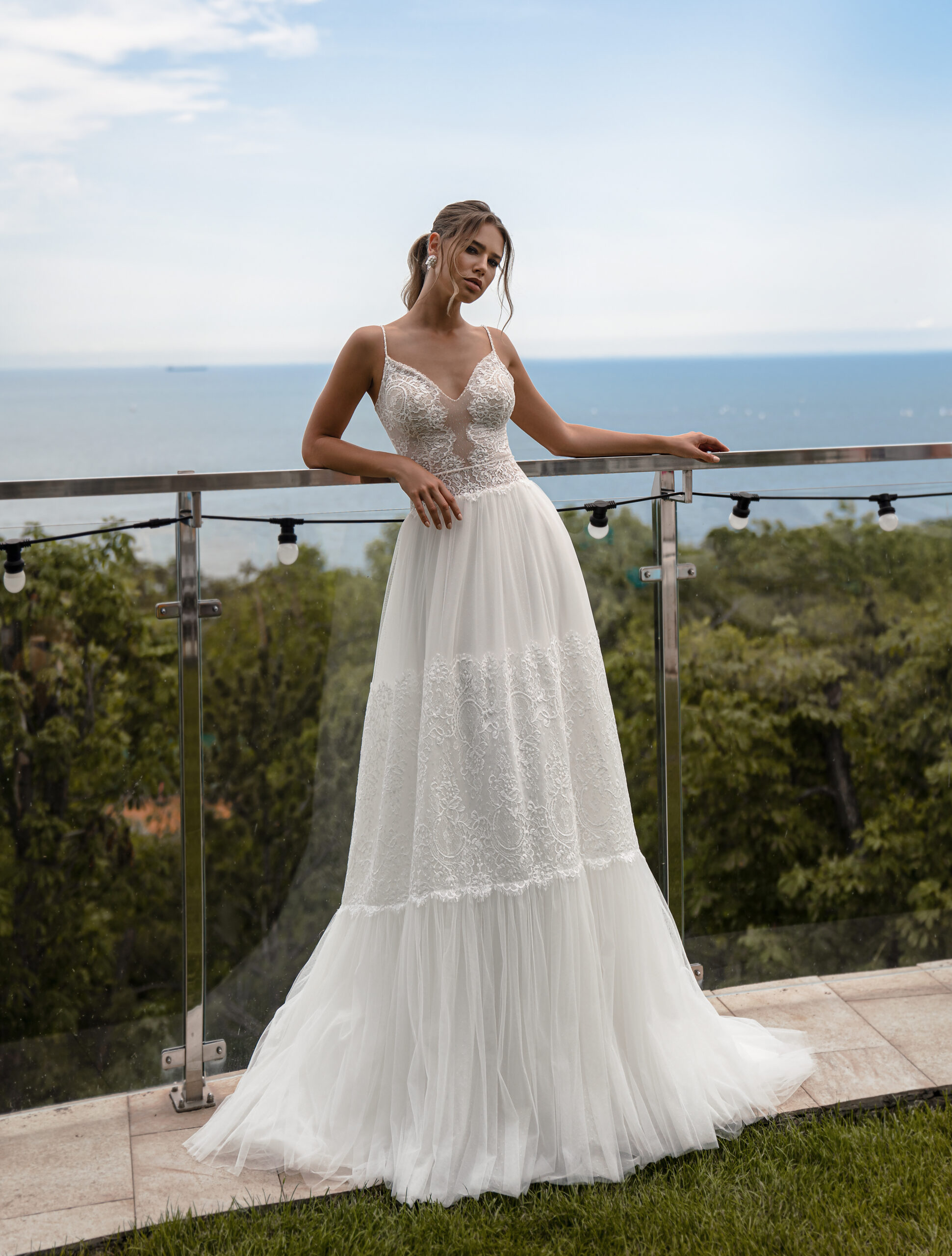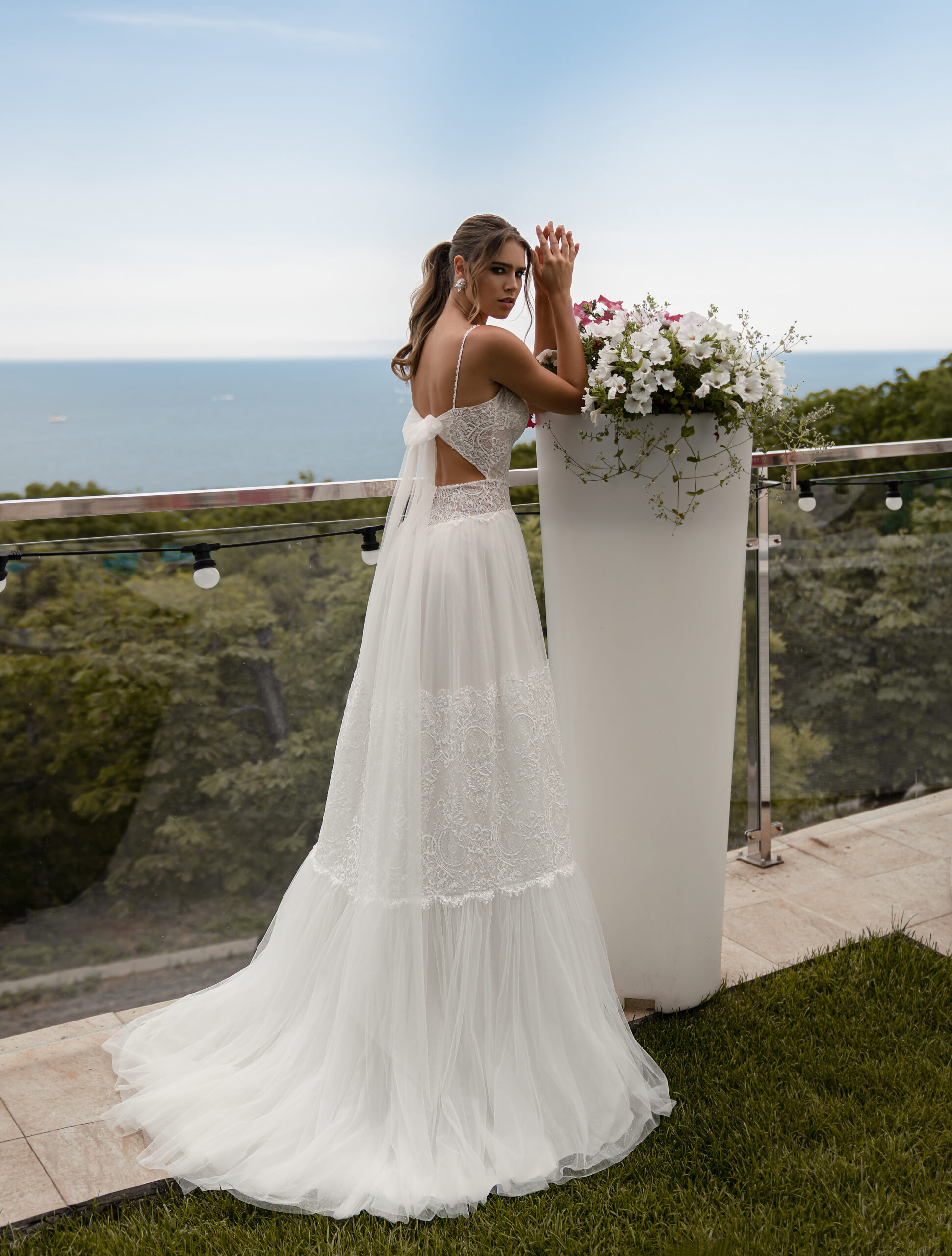 Light boho wedding dress with thin straps with a small train. Translucent soft bodice embroidered with sequins. The back is decorated with an elegant bow. The model is embroidered with crystal and silver beads. The skirt also has airy ruffles made of euromesh and lace, which adds even more lightness to the image.