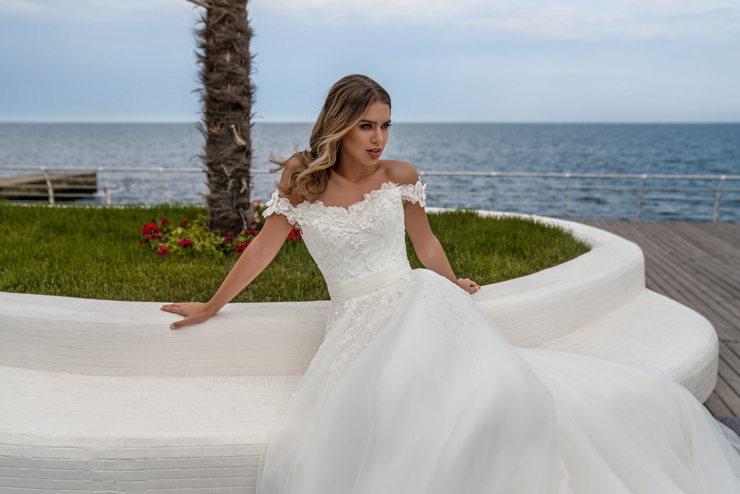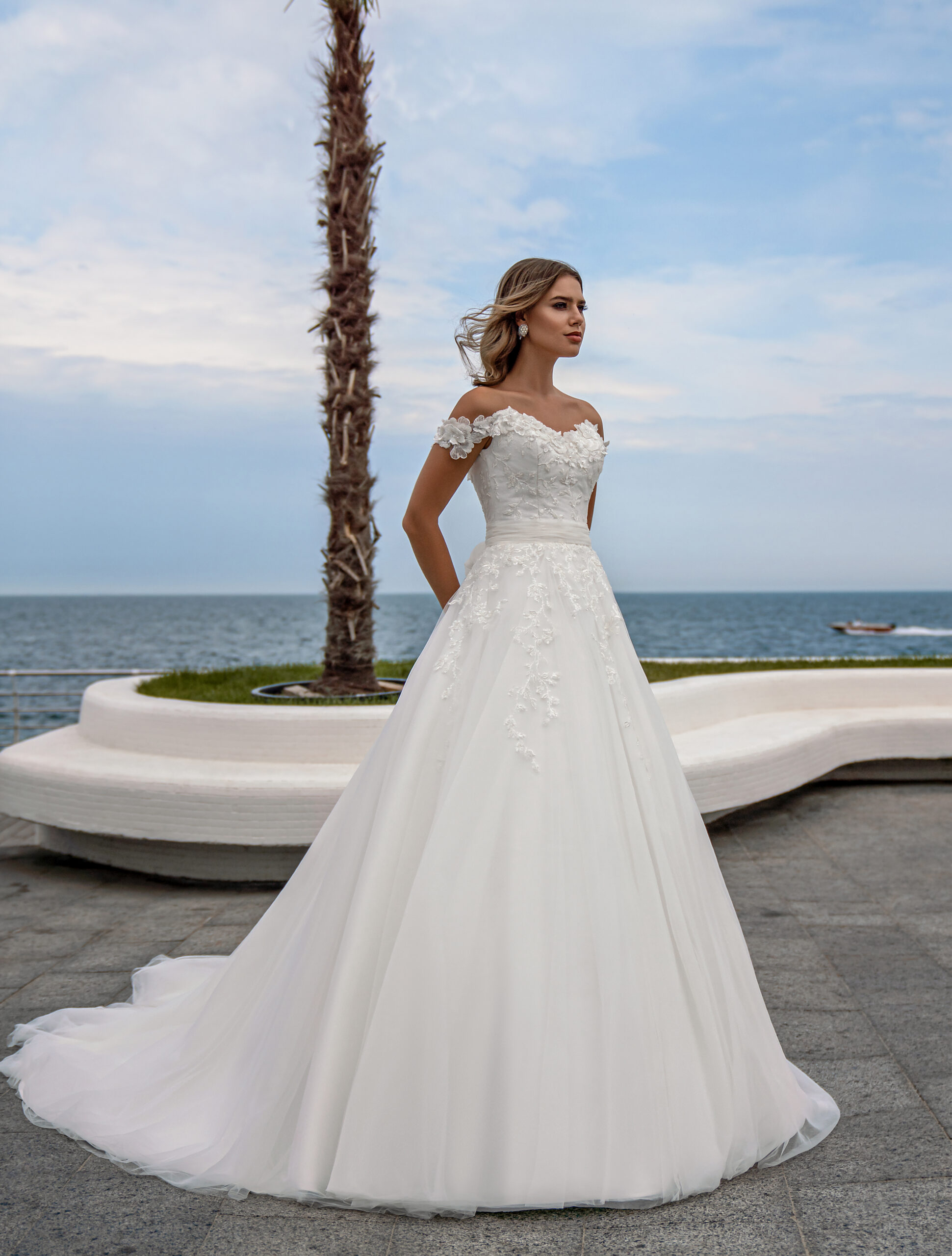 Delicate off-the-shoulder wedding dress with a fluffy skirt with a train. The corset to the waist is covered with Chantilly and decorated with guipure, embroidered with beads and sequins. Fluffy skirt decorated with guipure elements The waist is decorated with a belt with an elegant drapery, which is tied at the back with a bow.