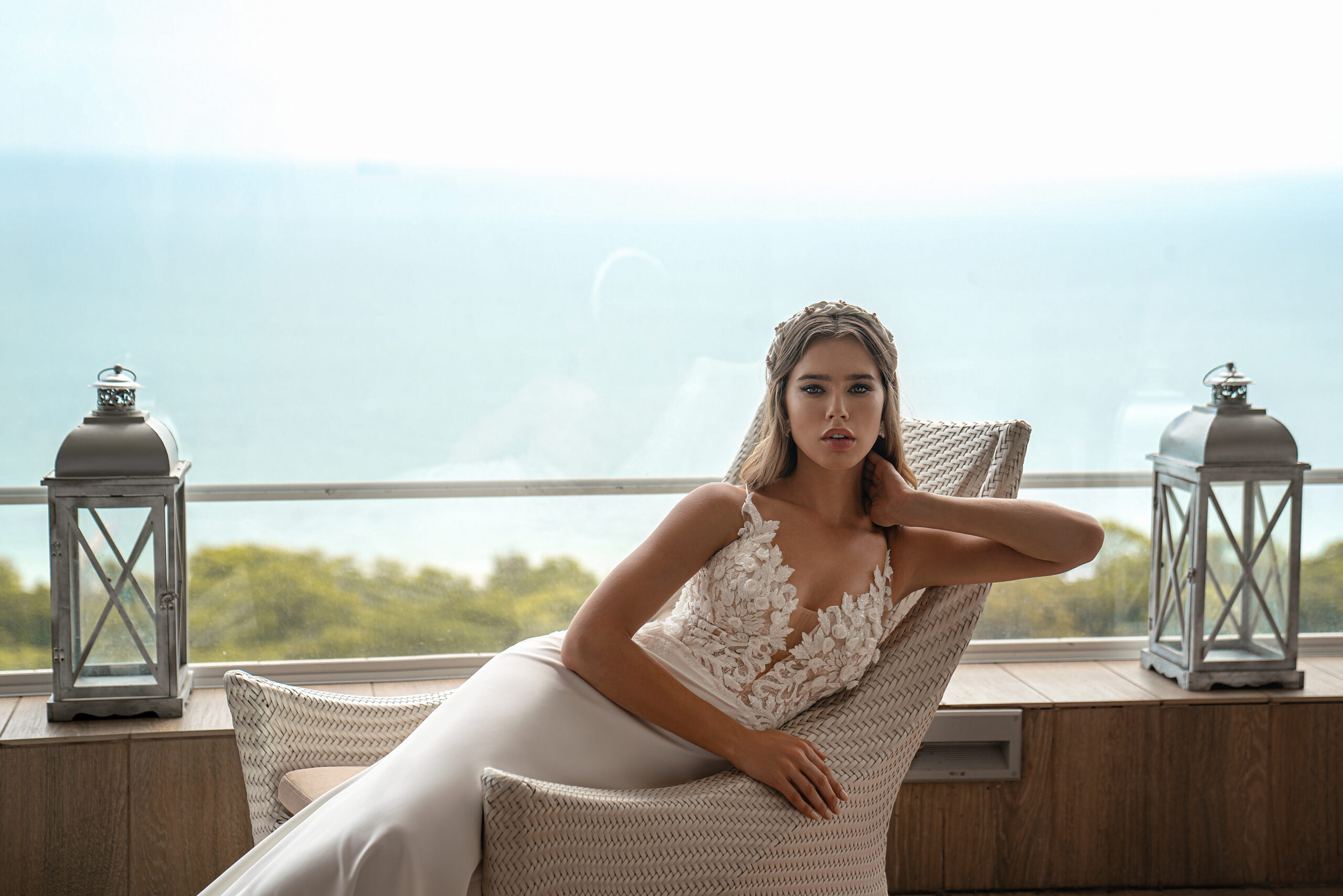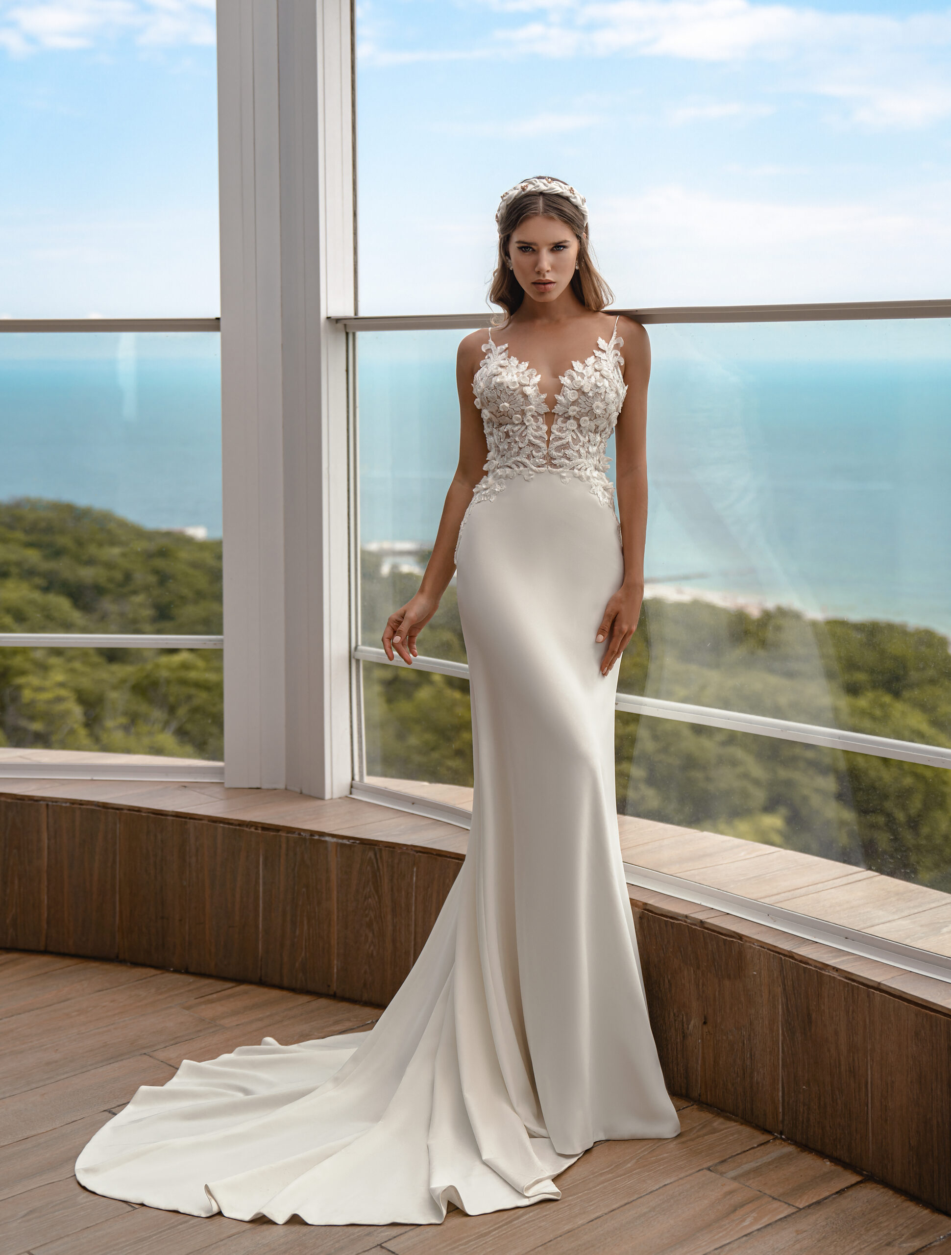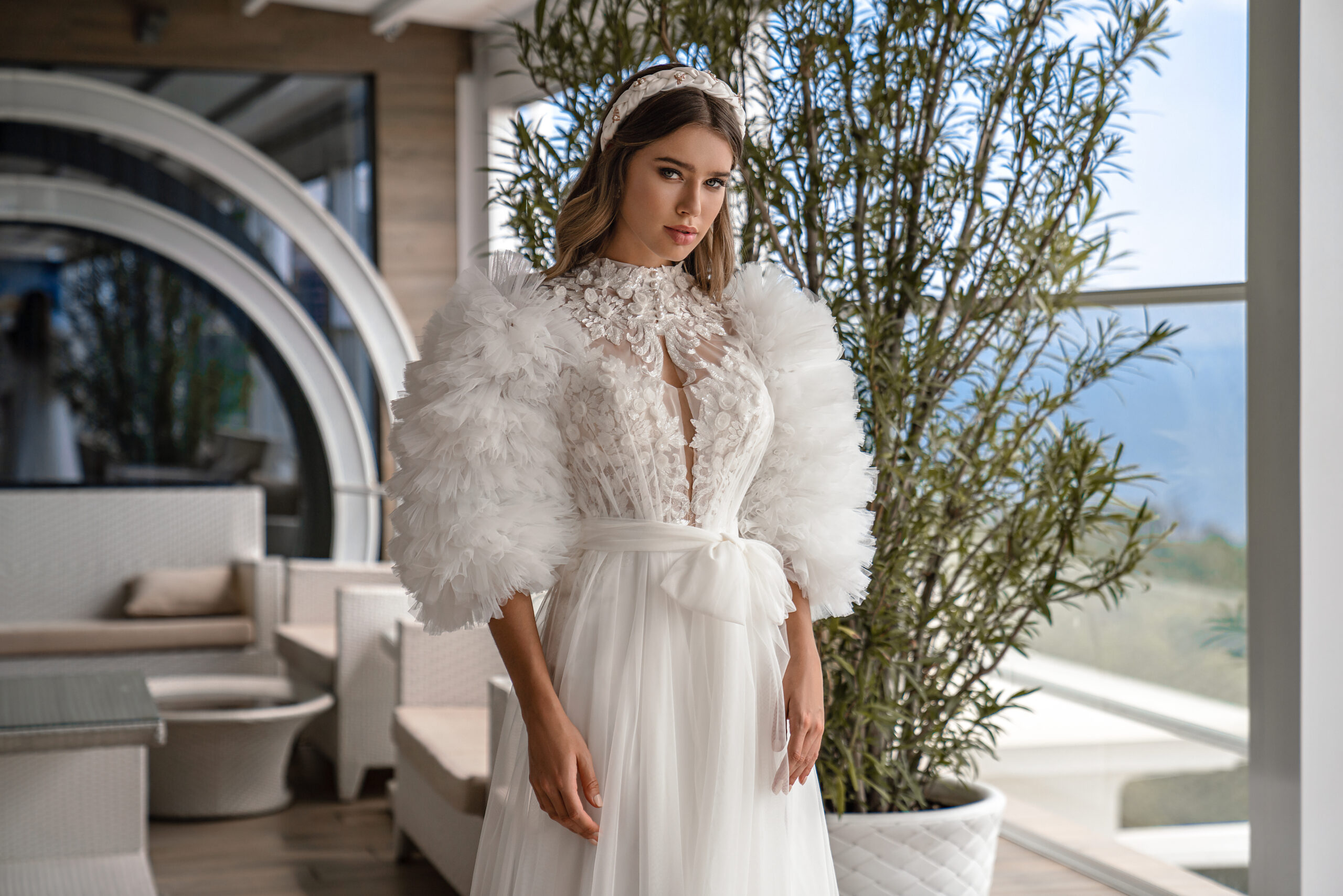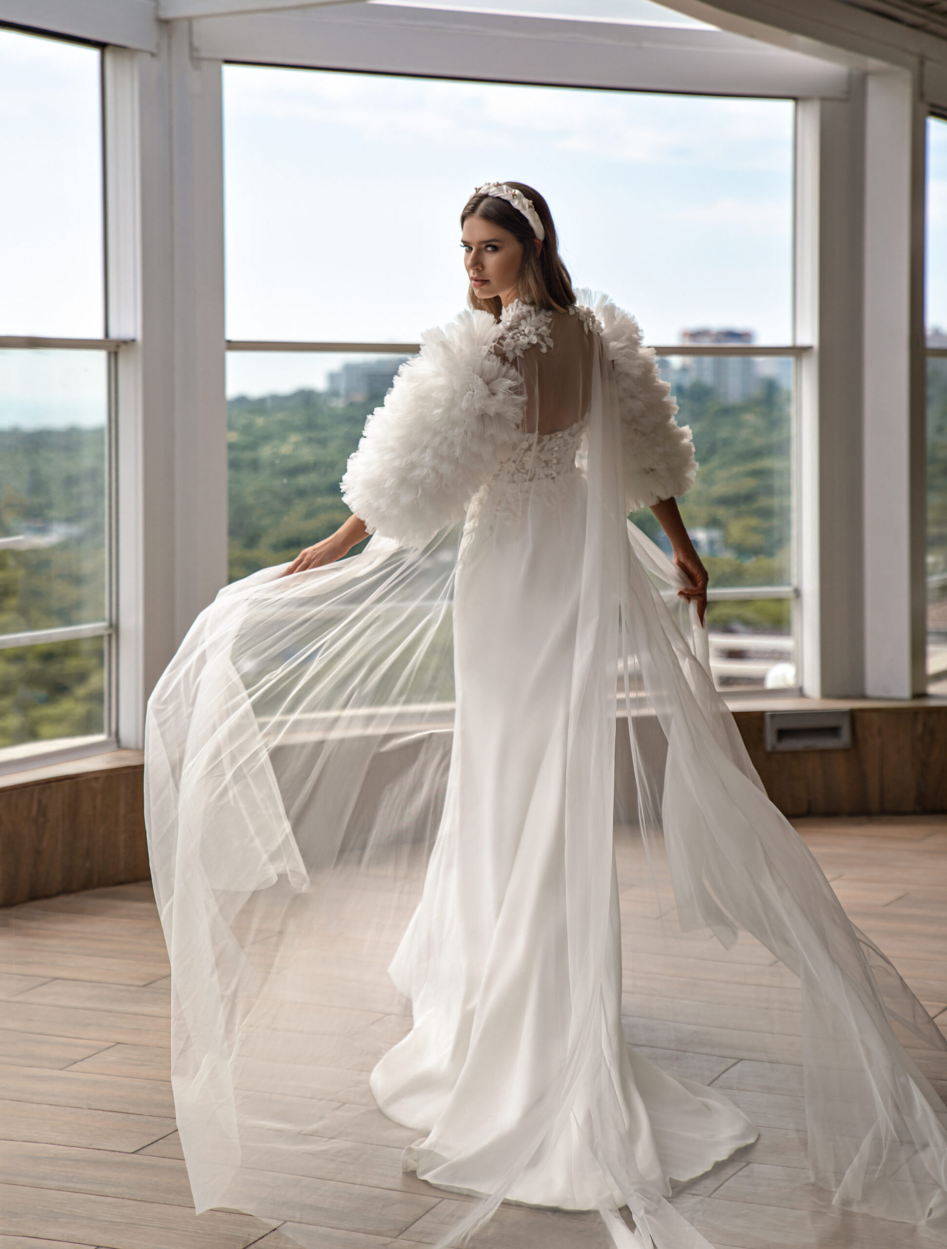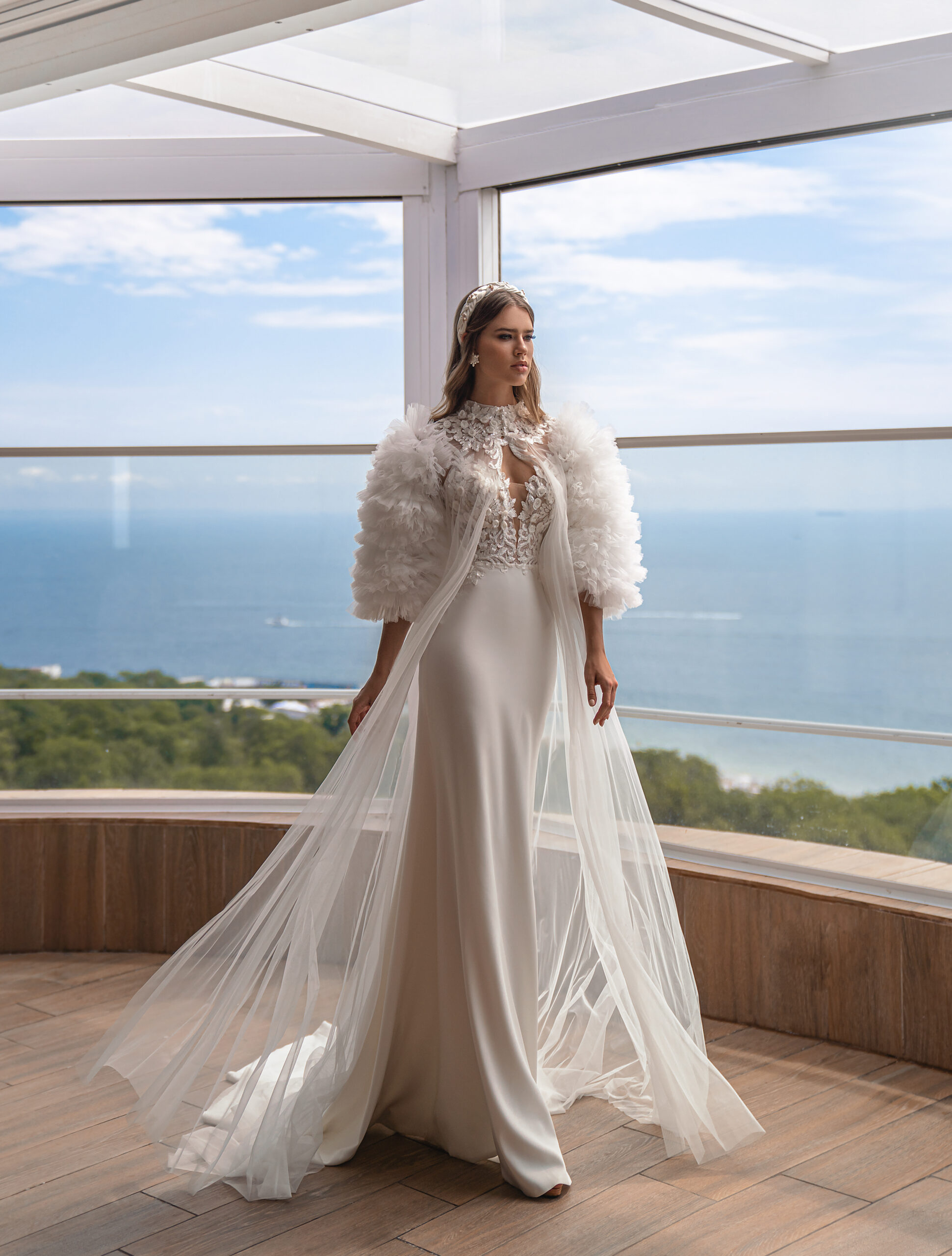 An amazing wedding set consisting of a strappy dress with a skirt with a train, a godet silhouette and a raincoat with puffy sleeves, with a collar and a removable bow belt at the waist. Translucent bodice with straps to the waist, adds lightness to the image. The skirt smoothly fits the figure, emphasizing its advantages. The model is decorated with voluminous guipure, embroidered with beads, sequins and flowers.