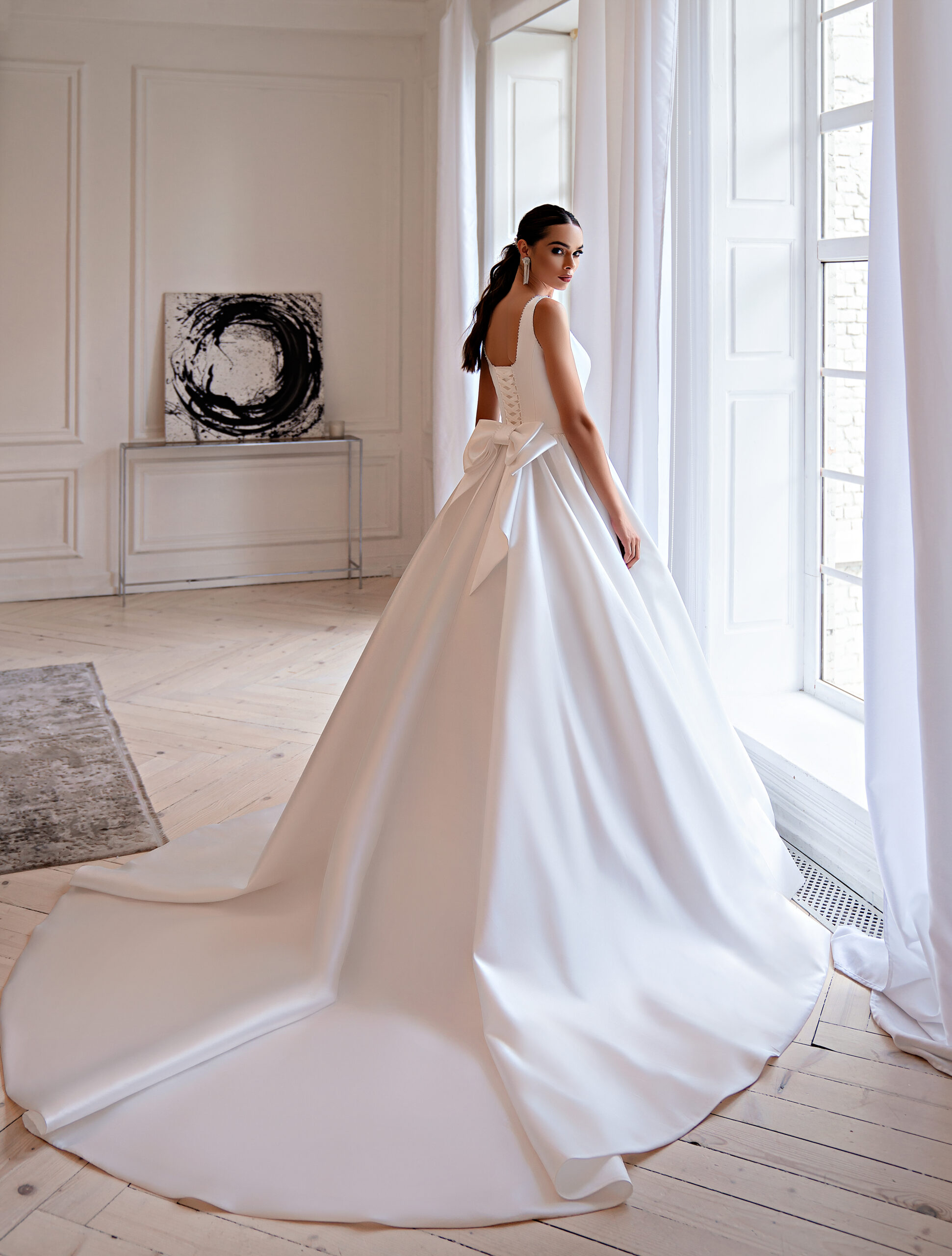 Stunning wedding dress with straps in the style of “minimalism”. The model is made of luxurious mikado fabric. The waist-length corset with a square neckline in the front is complemented by a thin belt that gracefully emphasizes the waist. The laced back is decorated with a double removable bow. The dress is skilfully embroidered with crystals around the belt, neckline, armhole, loops and bow membranes