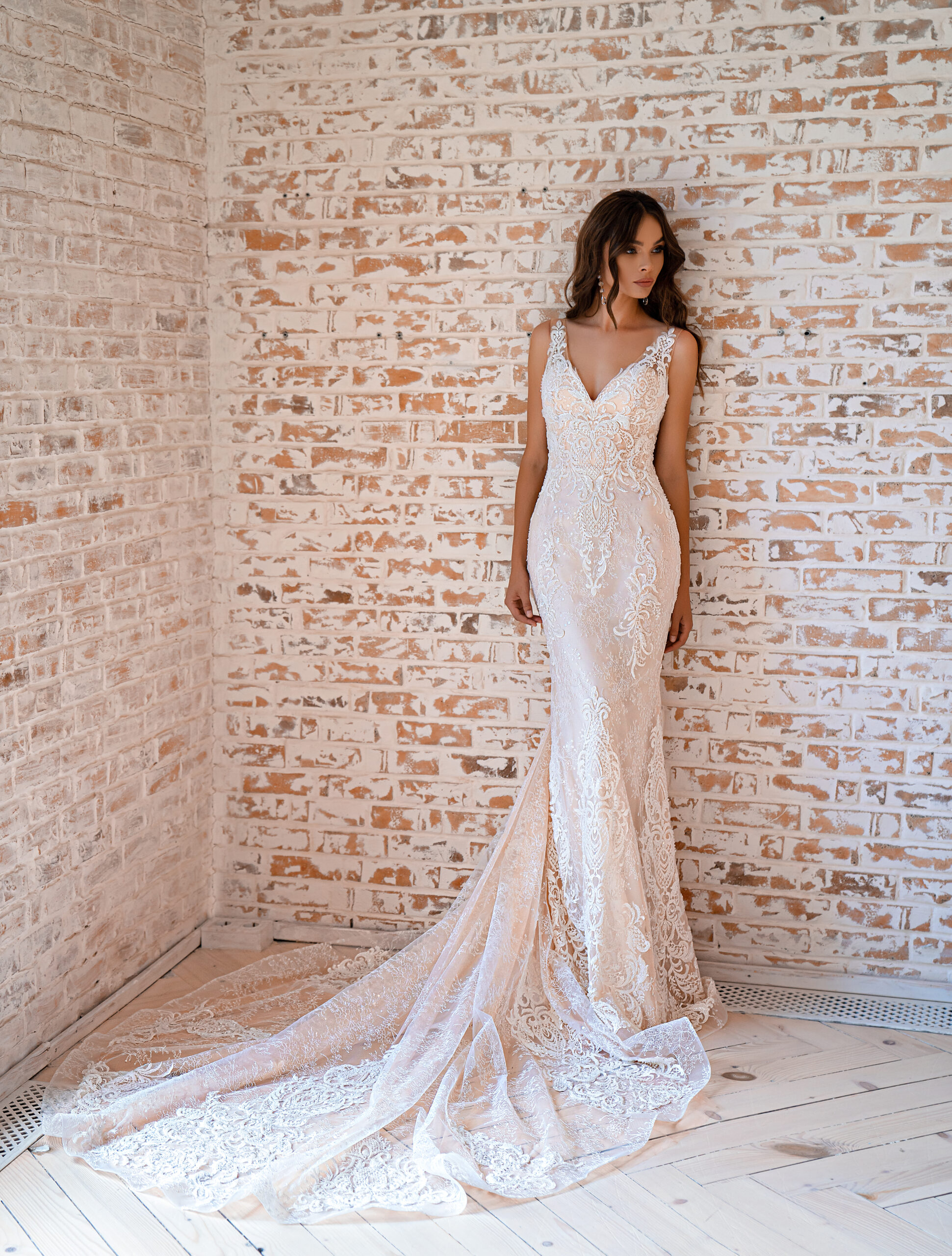 A wonderful wedding dress with a godet silhouette. The strappy corset is decorated with a V-neckline on the front and back and is complemented by guipure sequins. The model is decorated with guipure embroidered with beads, sequins, crystals and pearls. The image is complemented by a long luxurious train, giving incomparability and royal grandeur.