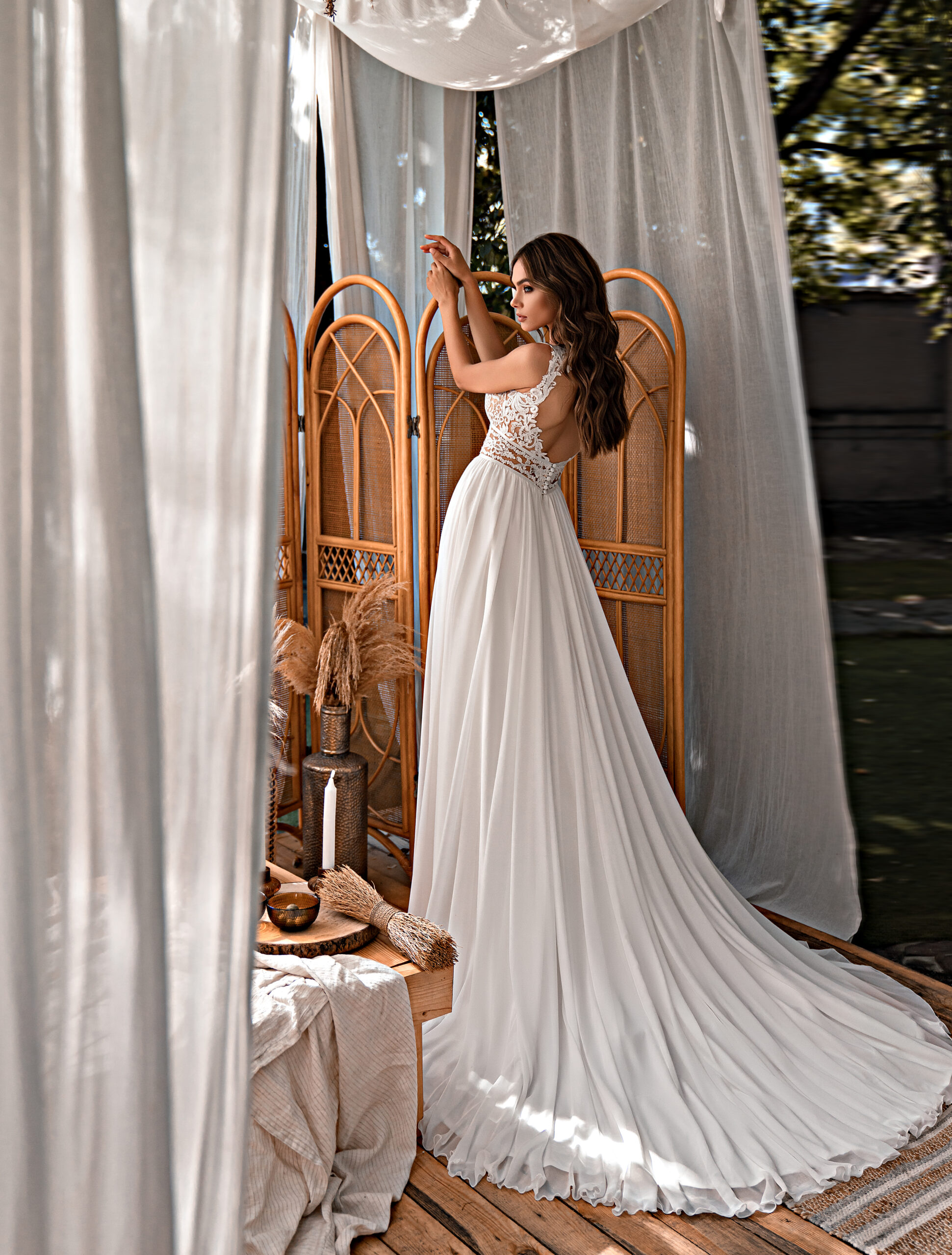 A light boho wedding dress with a soft skirt with a train. Waist-length corset with a “V” neckline in the front and an elegant curly neckline along the back. A luxurious multi-chiffon skirt is complemented by an attractive slit on the right leg. The model is skilfully decorated with elements of guipure embroidered with sequins, with cord and braid.